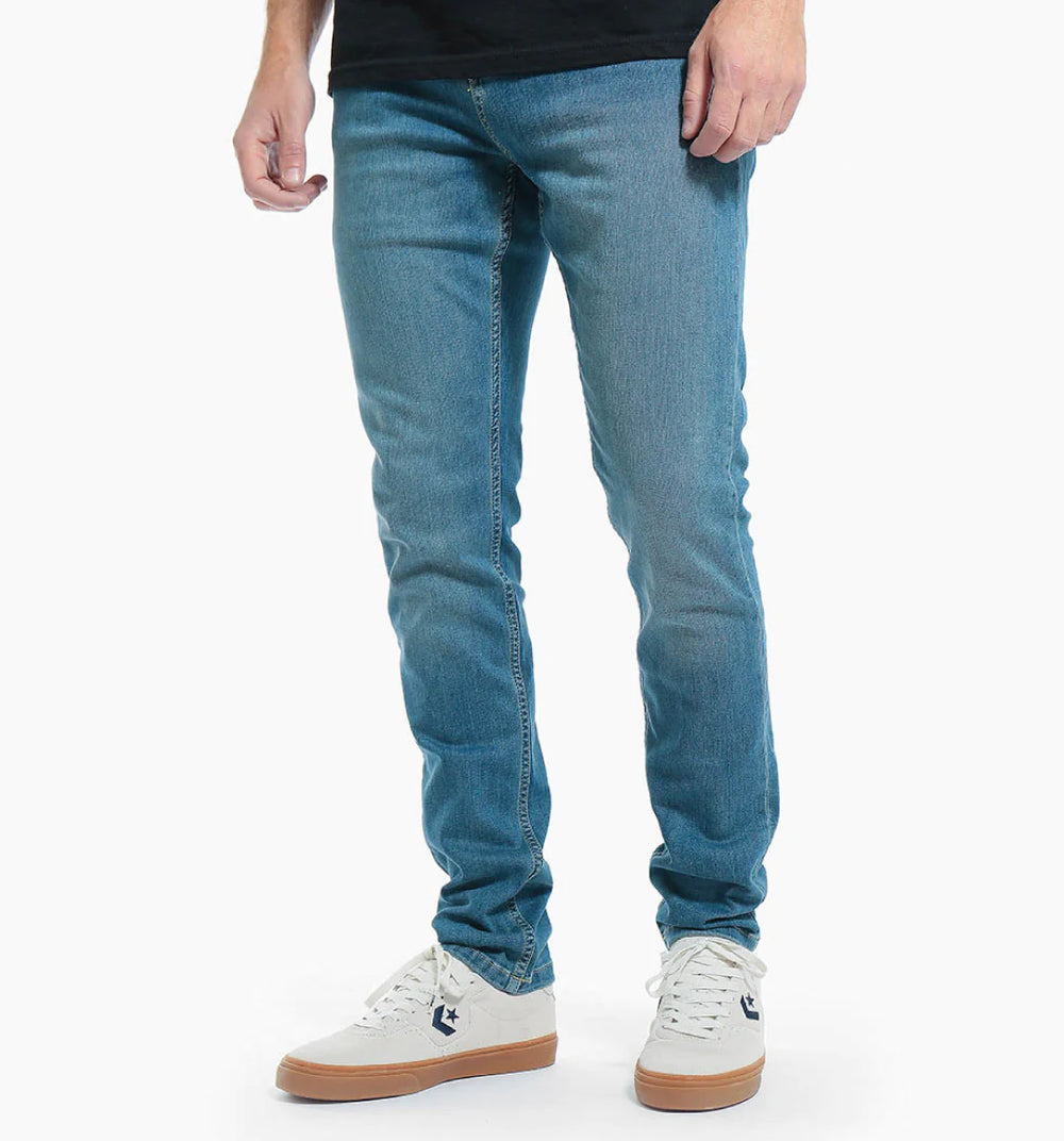 With a regular rise, our ‘Skinny’ denim tapers from the thigh all the way down to a slim ankle opening. Constructed from 12oz denim with 2% elastane, it provides the perfect blend of durability and mobility required when skateboarding. Available in a standard leg 32” as well as a short leg 30” and available in our multiple signature washes. It has a 5 pocket design, with YKK zippers, branded button waist fastening and flat rivet details.