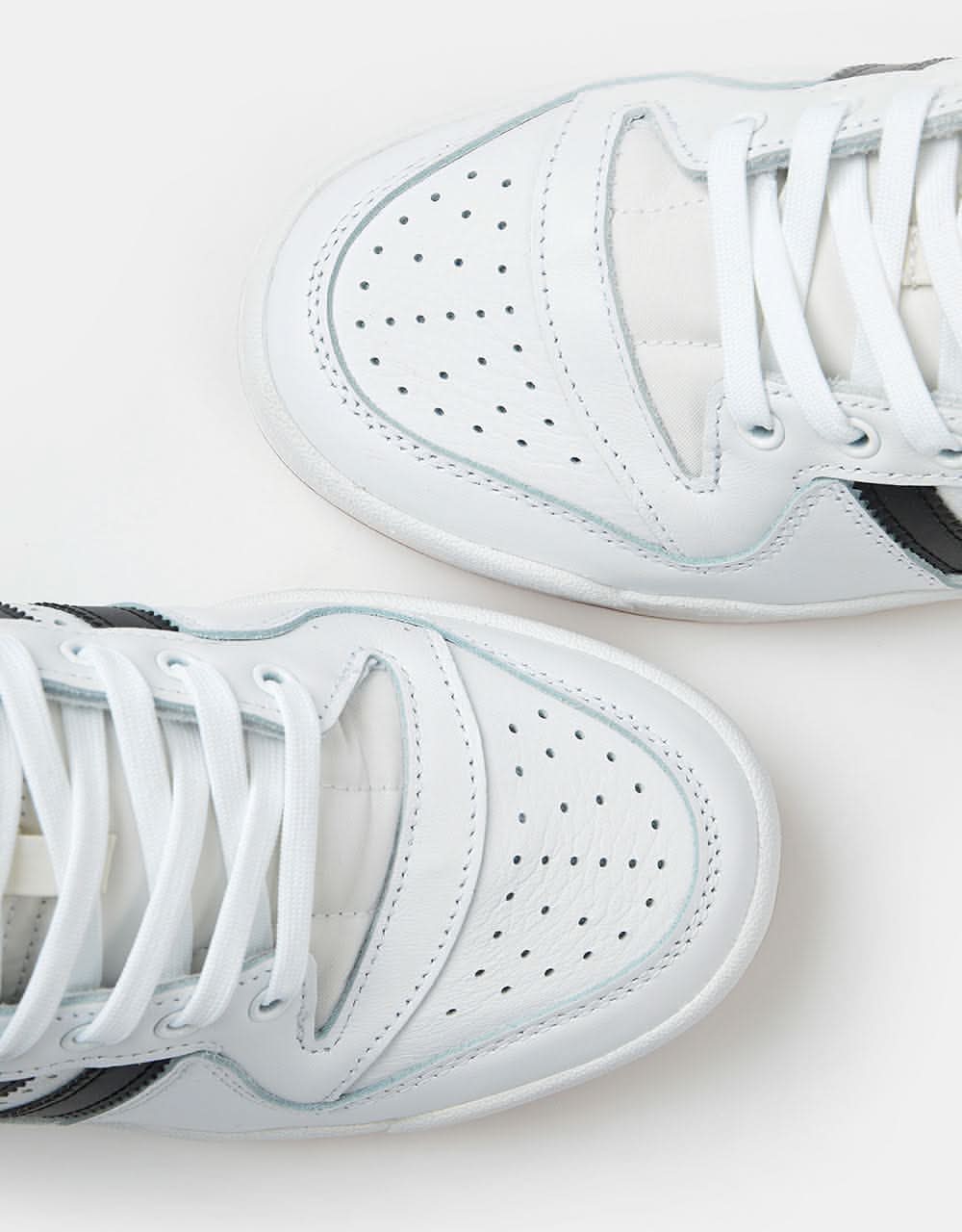 The Forum 84 is a classic basketball silhouette from Adidas, updated and adopted by skateboarding. The White/Core Black/White colourway features leather and suede uppers, layered in all the high wear areas. Whilst these are much chunkier than most shoes being released, the chunky silhouette is complemented by a thin cup sole offering great board feel. The Sole is made from a tacky gum rubber in a circle pattern to provide a constant, consistent grip when skating.