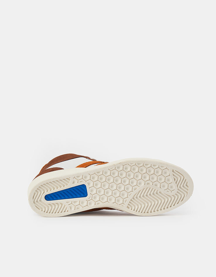 The adidas Superskate Skate Shoes in Preloved Brown/Rustic Orange/Crystal White combine elements of past Adidas silhouettes with contemporary skate tech. A '70s icon from the vaults with tons of adi heritage has been retooled for skateboarding. A mid-top silhouette made with a durable leather and suede upper, a redesigned heel for fit and comfort, a reinforced ollie area and toe for durability, as well as an EVA sockliner and heel for cushioning and supreme board feel.