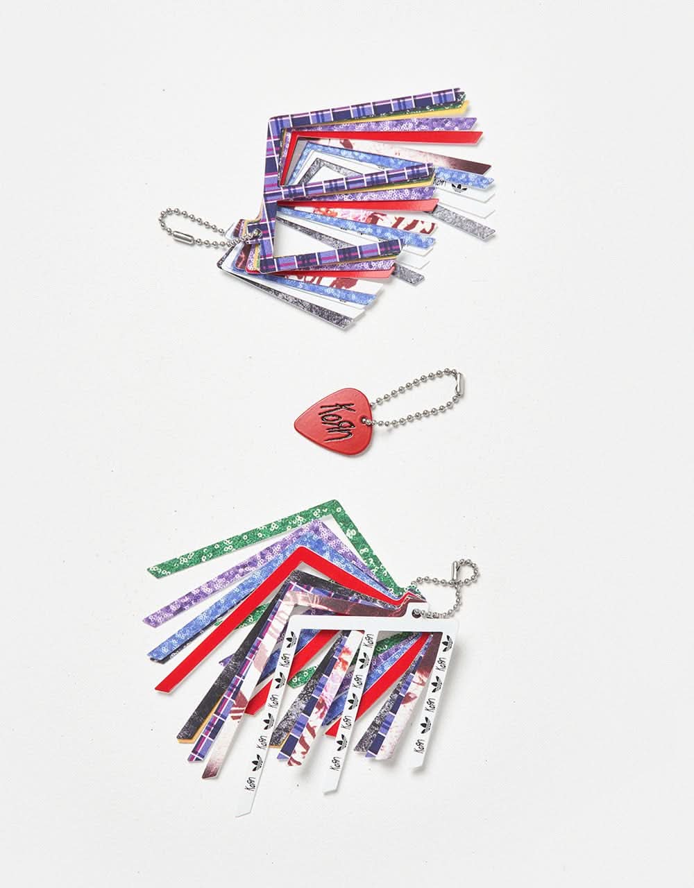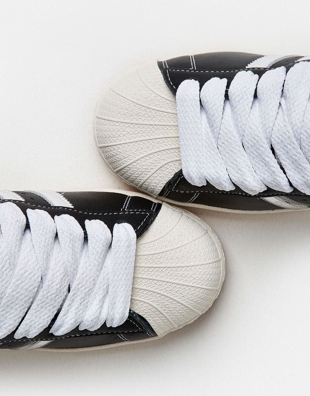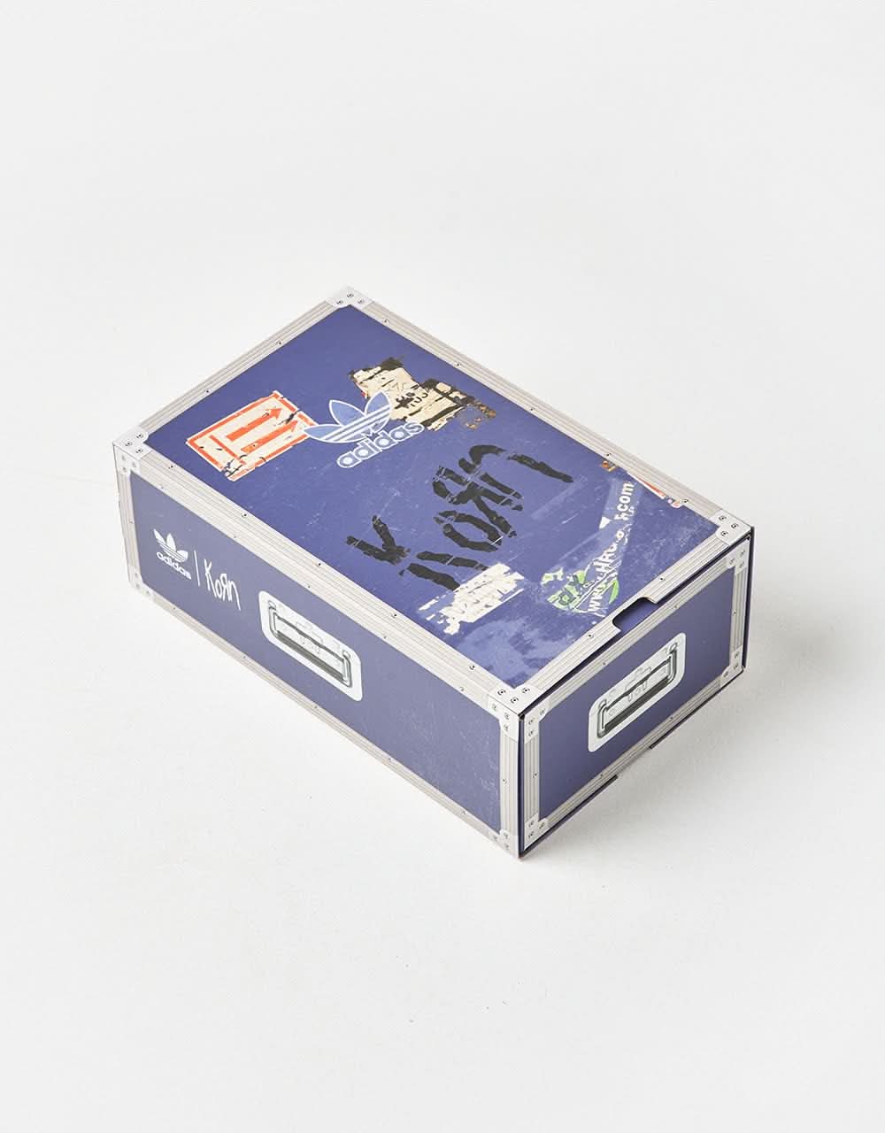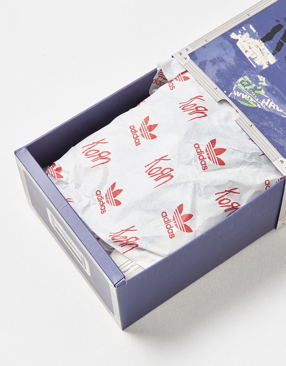 Coming in a clean black and white colourway, the Superstar features a premium all-leather upper. Transparent Three Stripes adorn the sides with customisable pattern slots, including album cover artwork, tartan and Korn x adidas branding. Golden Superstar branding in a KoЯn font sits beside the Three Stripes. On the heels, a white leather heel tab features KoЯn on the right shoe and the adidas trefoil on the left. At the front, the classic rubber shelltoe in off-white, which matches the midsole. This is all finished off with a gum rubber outsole. The shoes are accompanied by 90s style fat white laces, custom-printed cover artwork insoles, a custom box and a guitar pick tag.