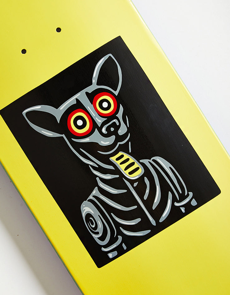 The Almost Mullen Dog Impact Light Skateboard Deck is a pro model for Rodney Mullen coming in at 8" wide. The deck features a robot dog graphic on a yellow background.