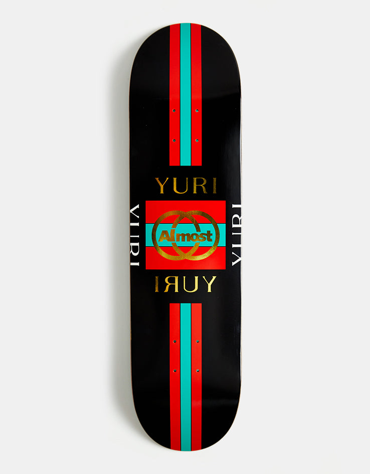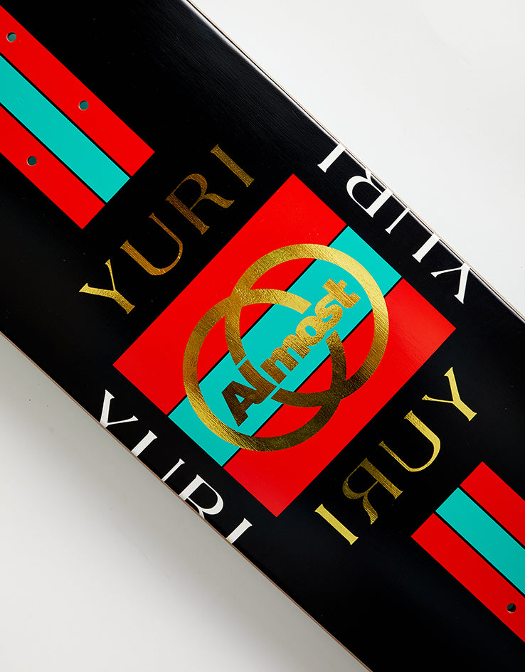 The Almost Yuri Luxury Super Sap R7 Skateboard Deck is a pro model for Yuri Facchini coming in at 8.125" or 8.375" wide with Super Sap R7 construction. The deck features a rip off of the Gucci logo on a black background.