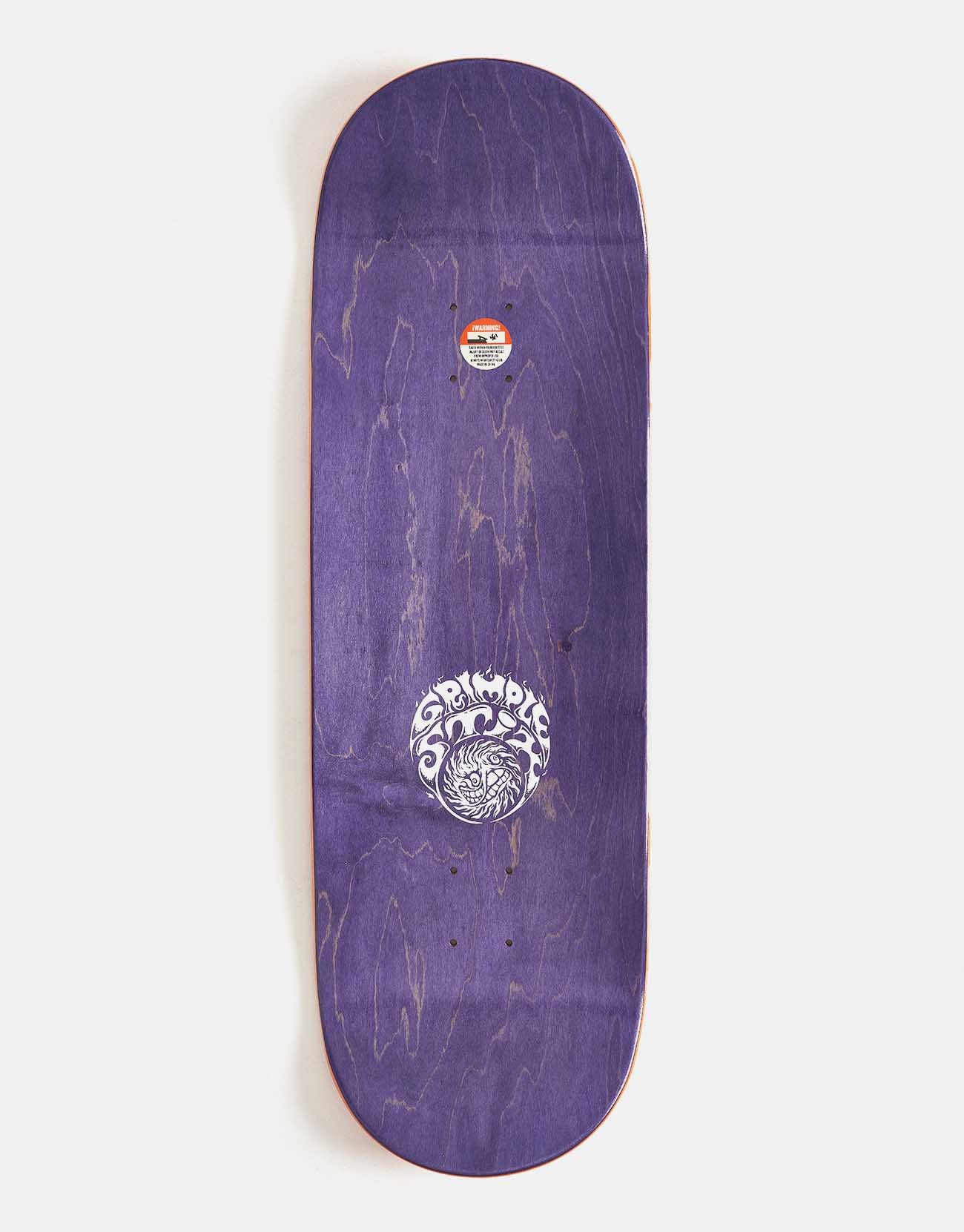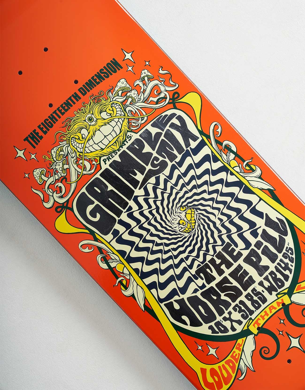 The Anti Hero Grimple Stix Litho 'Horse Pill' Skateboard Deck is a team board coming in at 10" wide. The deck features a trippy Grimple design and the words "The Eighteenth Dimension" on an orange background.