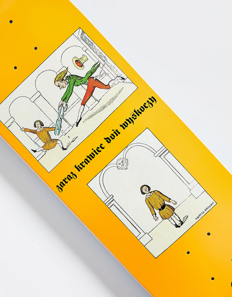 The Arbor Amelia Folklore Skateboard Deck is a pro model for Amelia Brodka, blending modern street and classic pool shapes. The graphic features a medieval style cartoon on an orange background.