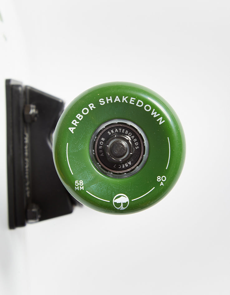 The Arbor Scorpion Shakedown 37 Cruiser Skateboard comes full set up and ready to skate. The deck features an illustration of a scorpion on a white background and is a shaped board. It comes full equipped with Paris Street 169mm Trucks, 58mm 80A Axel Serrat Wheels, and ABEC 7 Bearings with Spacers, making it the ideal board for skating it all.