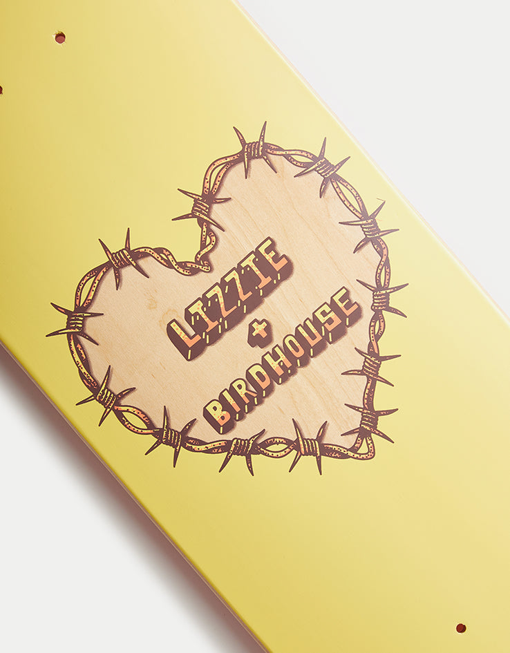 The Birdhouse Armanto Heart Protection Skateboard Deck is a pro model for Lizzie Armanto coming in at 8" wide. The deck features a barbed-wired heart in the centre, with the words "Lizzie + Birdhouse" in the middle of the heart. This sits on a yellow background.