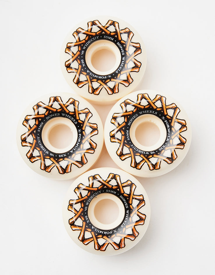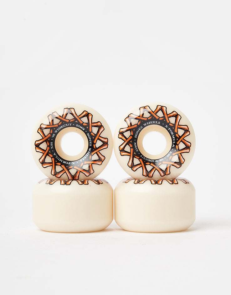 The Bones Crossbones X-Formula V6 Wide-Cut 95a Skateboard Wheels come in a variety of sizes and feature a sick crossbones graphic on white 95a urethane. Ideal for street skating, the X-Formula V6 Wide-Cut have a smooth wheel surface and the premium X-Formula urethane.