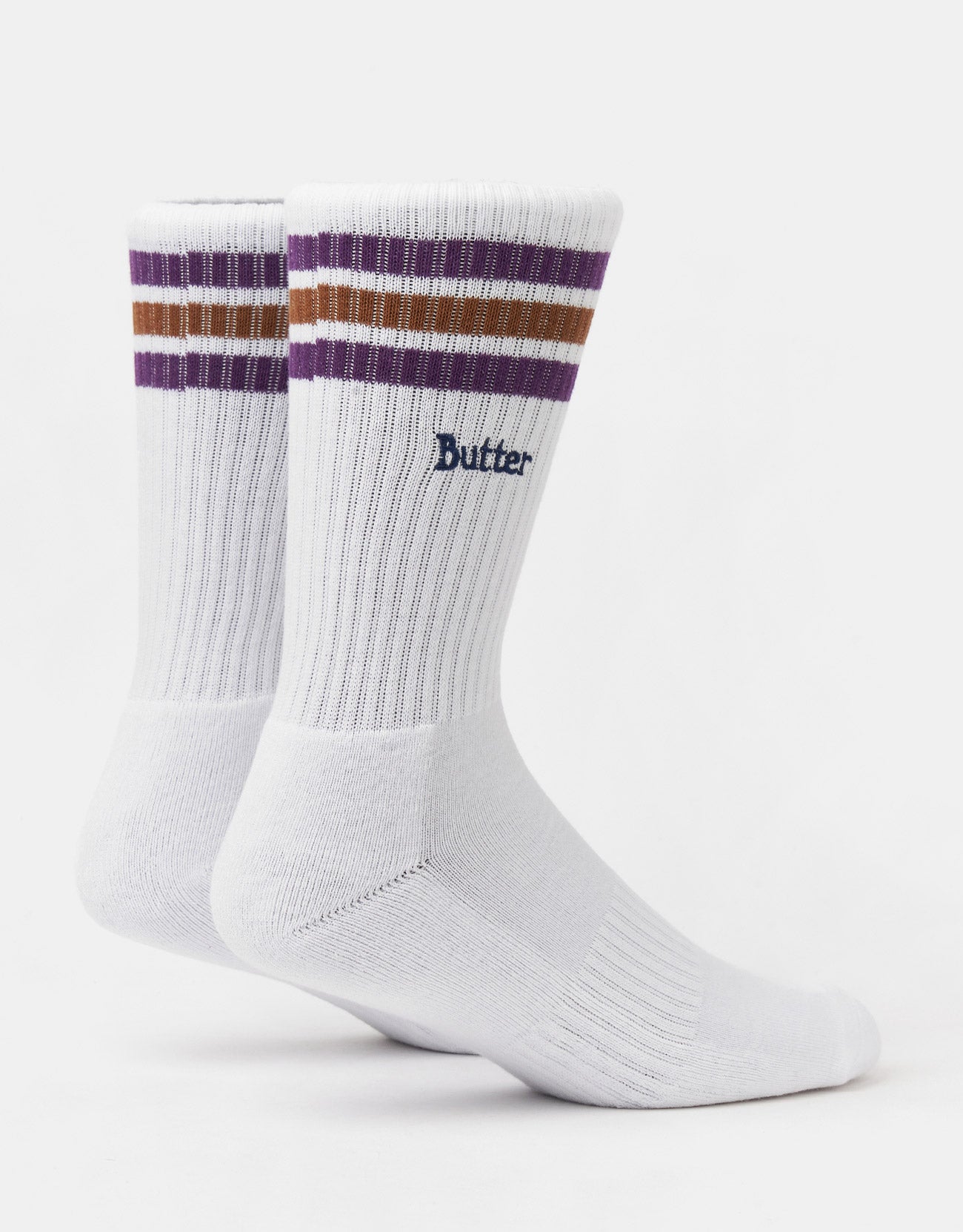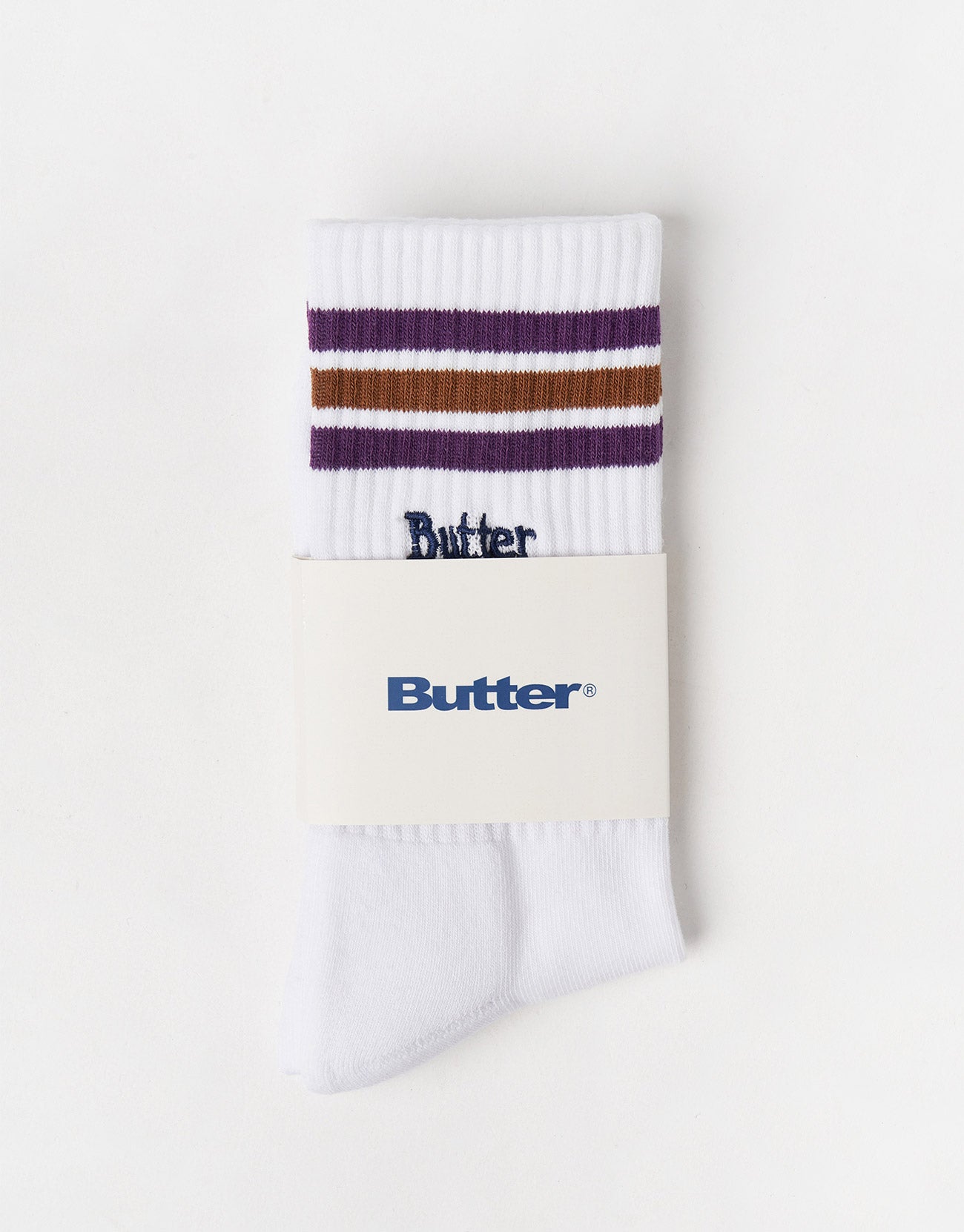 Introducing the Butter Goods Stripe Crew Socks in White, designed for comfort and style. These Butter Goods stripe socks feature a classic crew length with a vibrant stripe design, perfect for casual wear or adding a pop of color to your outfit. Made from a soft cotton blend, they ensure breathability and durability. The Butter Goods logo adds a touch of authenticity, making these skate socks a must-have accessory for your wardrobe.