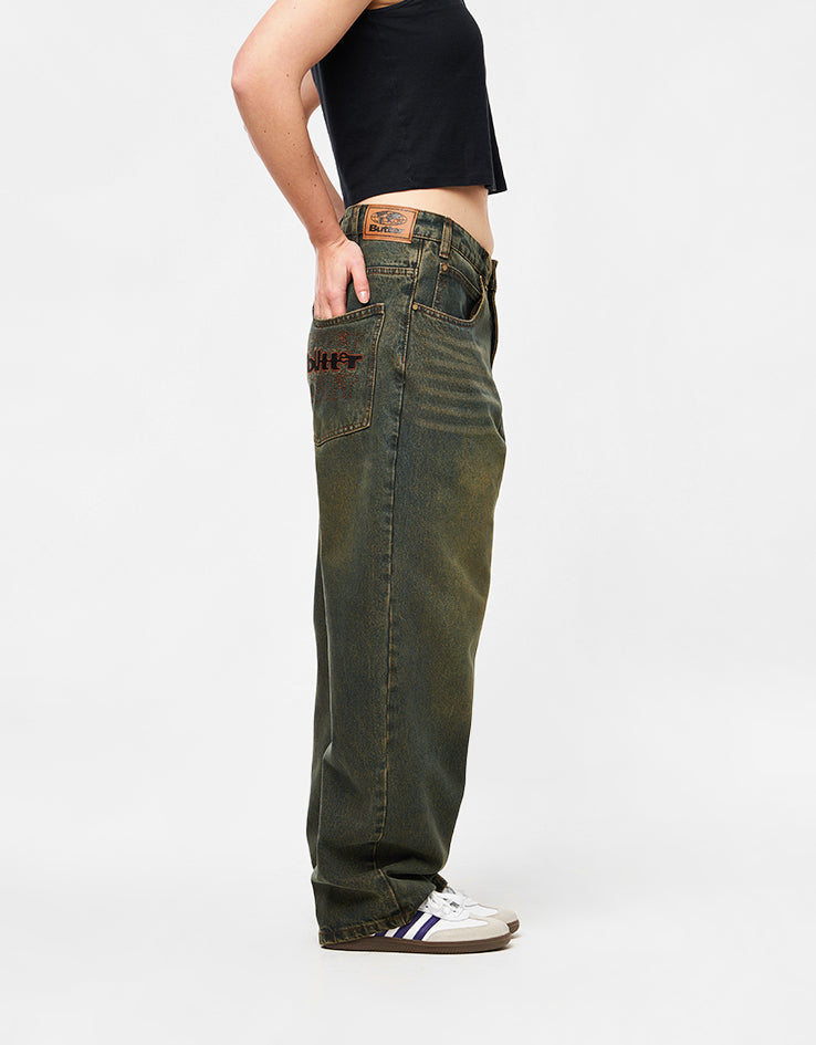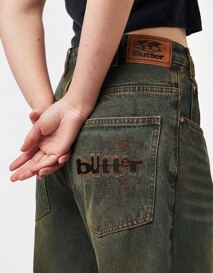 Upgrade your wardrobe with the Butter Goods Warped Denim Jeans in Dirty Wash Indigo, an essential addition to any outfit by our favourite skate brand from across the pond. These Butter Goods jeans are composed of 100% cotton, styled in a baggy fit perfect for skaters, and feature embroidered patch graphics that elevate your style.
