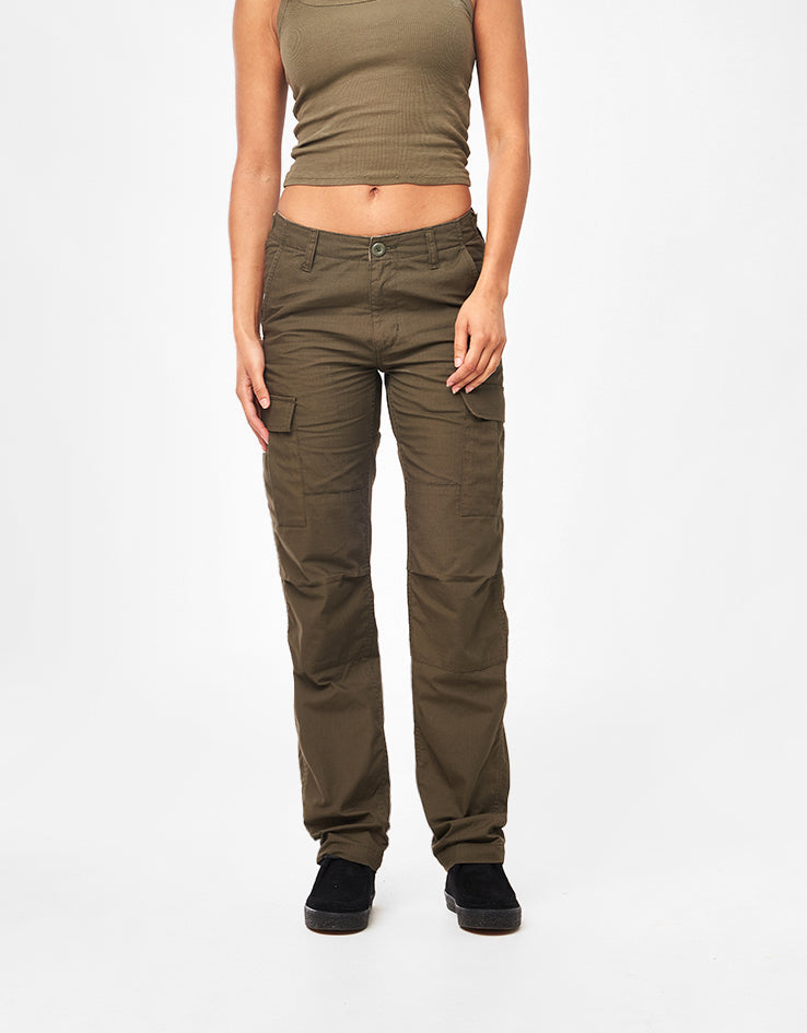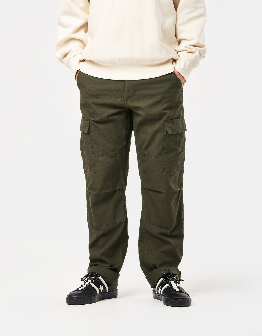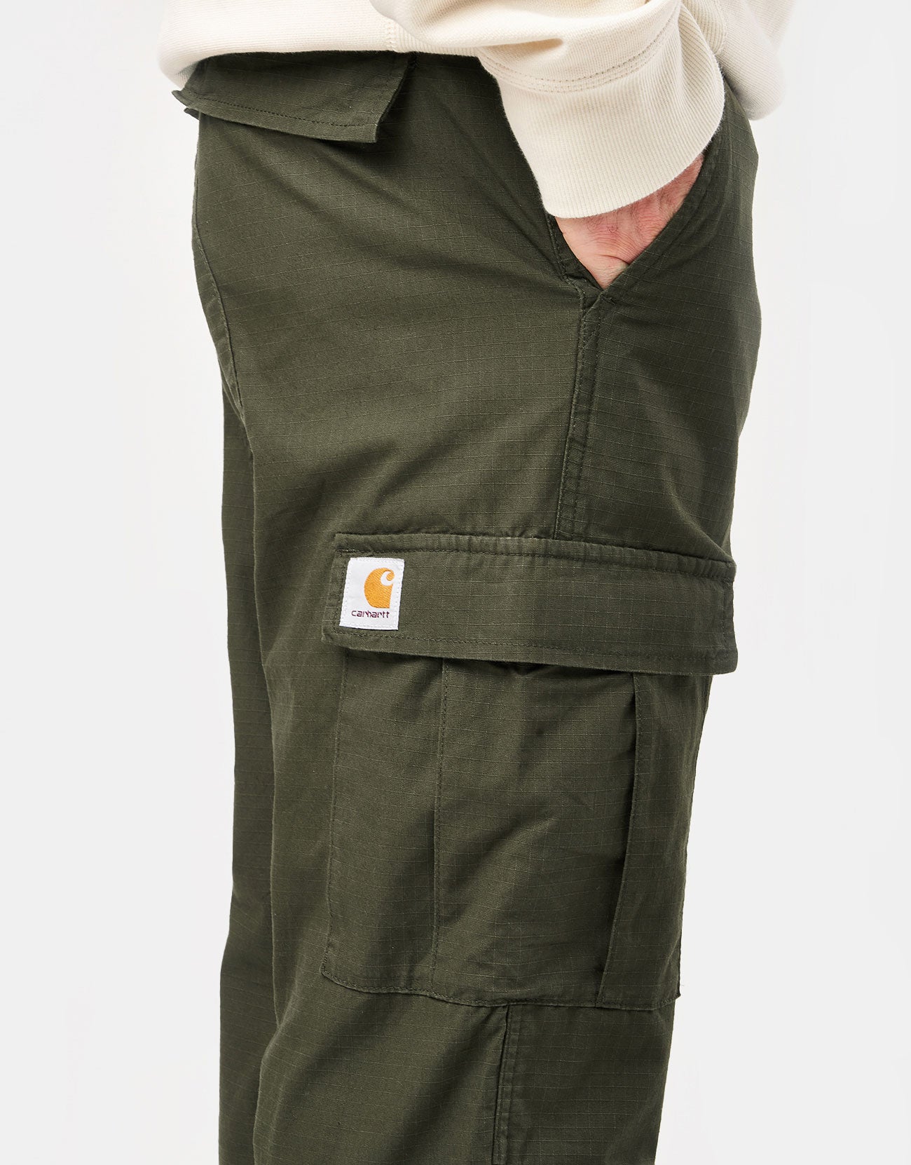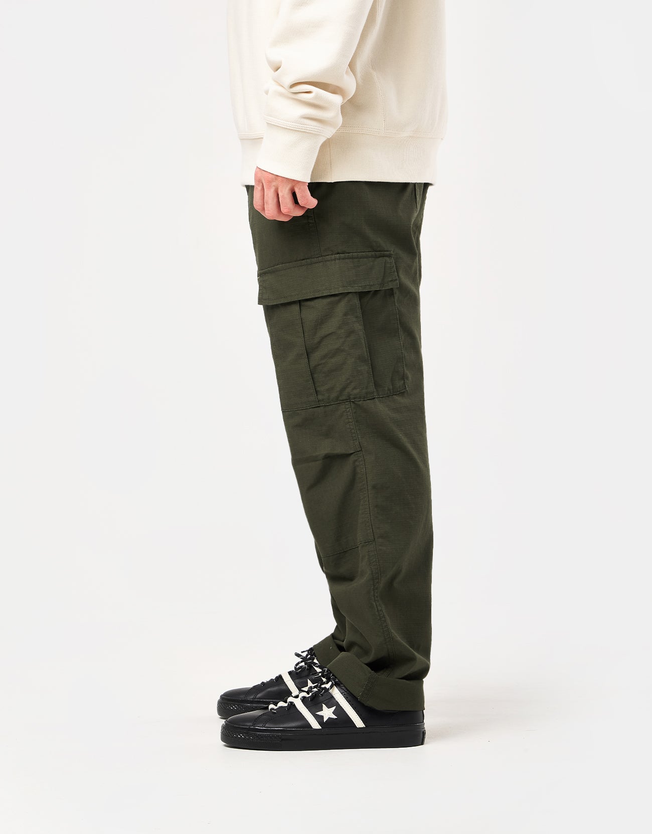 The Carhartt WIP Aviation Pant in Cypress (Rinsed) is a stylish choice for skaters and outdoor enthusiasts alike. These cargo pants feature a slim fit and are made from durable 100% cotton ripstop, making them perfect for any adventure.