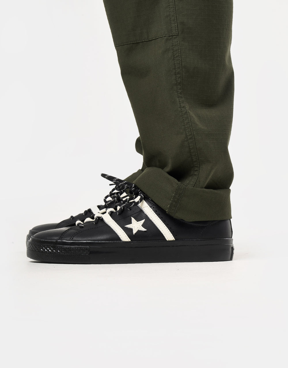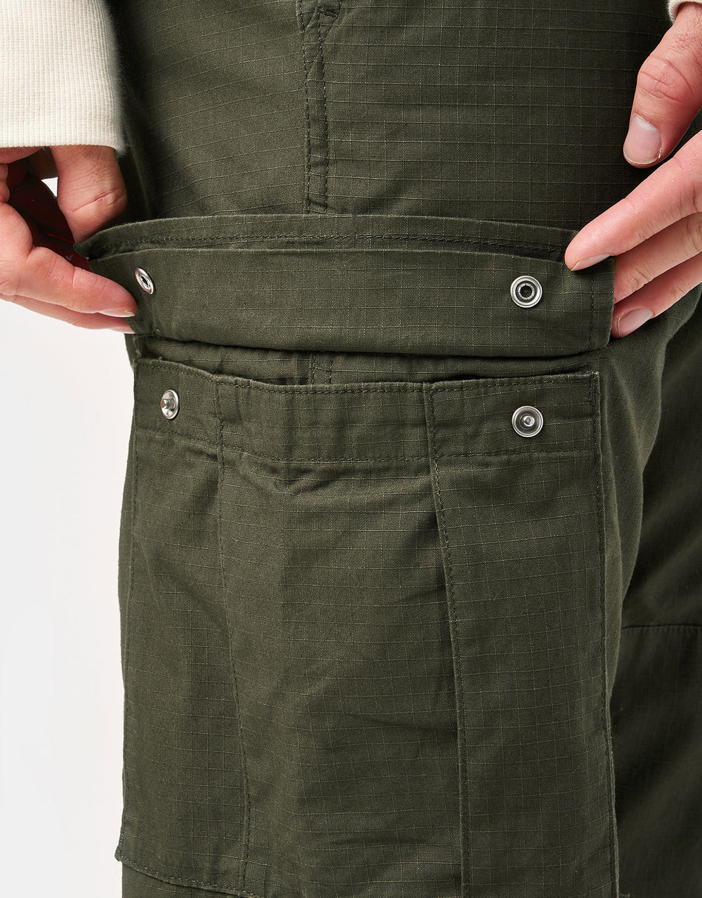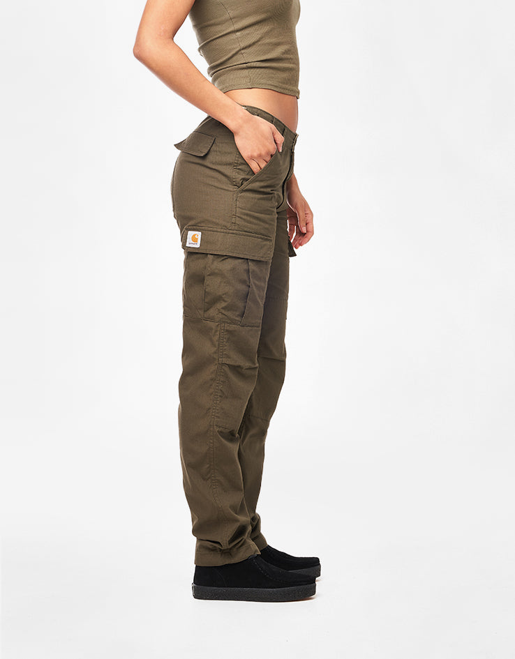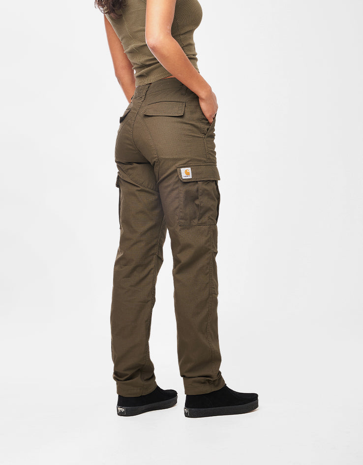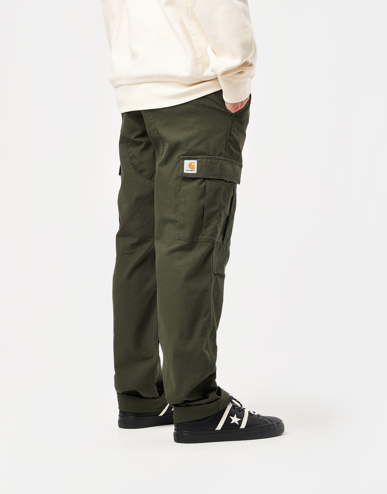 The Carhartt WIP Aviation Pant in Cypress (Rinsed) is a stylish choice for skaters and outdoor enthusiasts alike. These cargo pants feature a slim fit and are made from durable 100% cotton ripstop, making them perfect for any adventure.