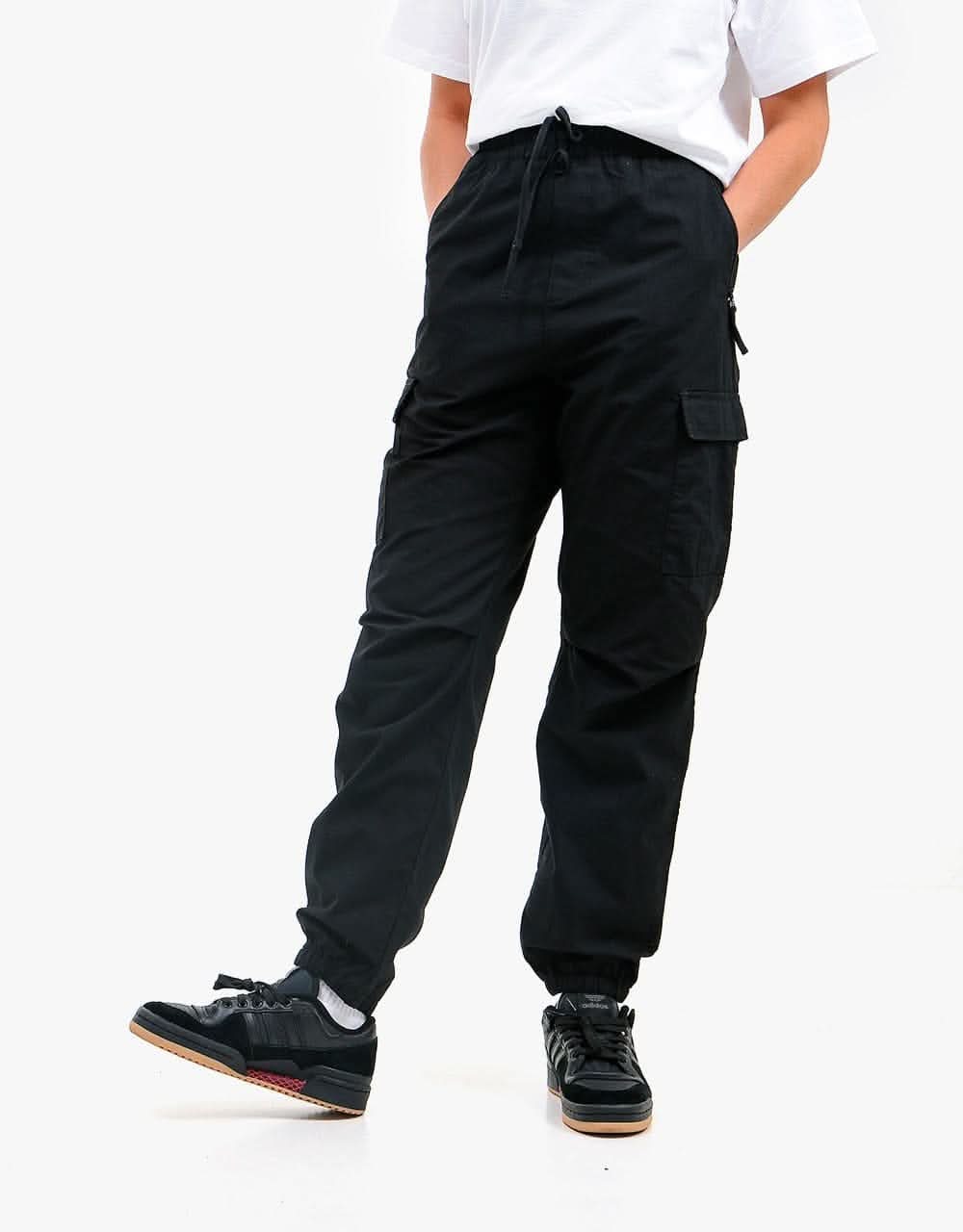 The Carhartt Cargo Jogger in Black (Rinsed) are a regular fit, low waist pant that have been constructed from 100% Cotton Ripstop and feature an adjustable drawstring waist, elasticated cuffed hems, zippered pockets and the Carhartt military label sewn onto the rear for premium branding.