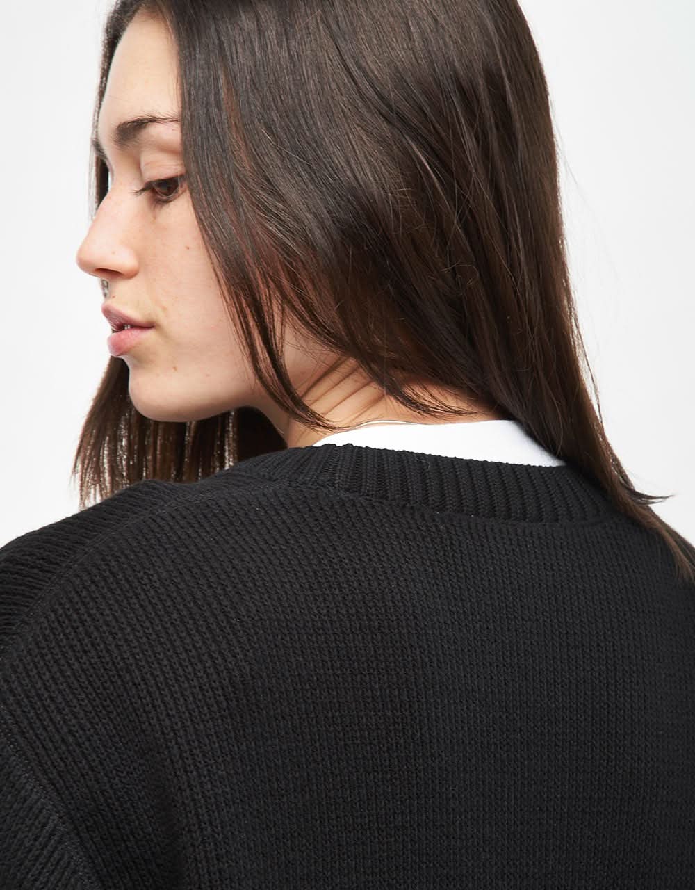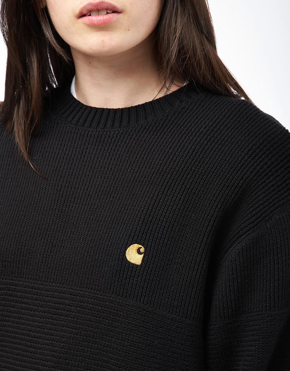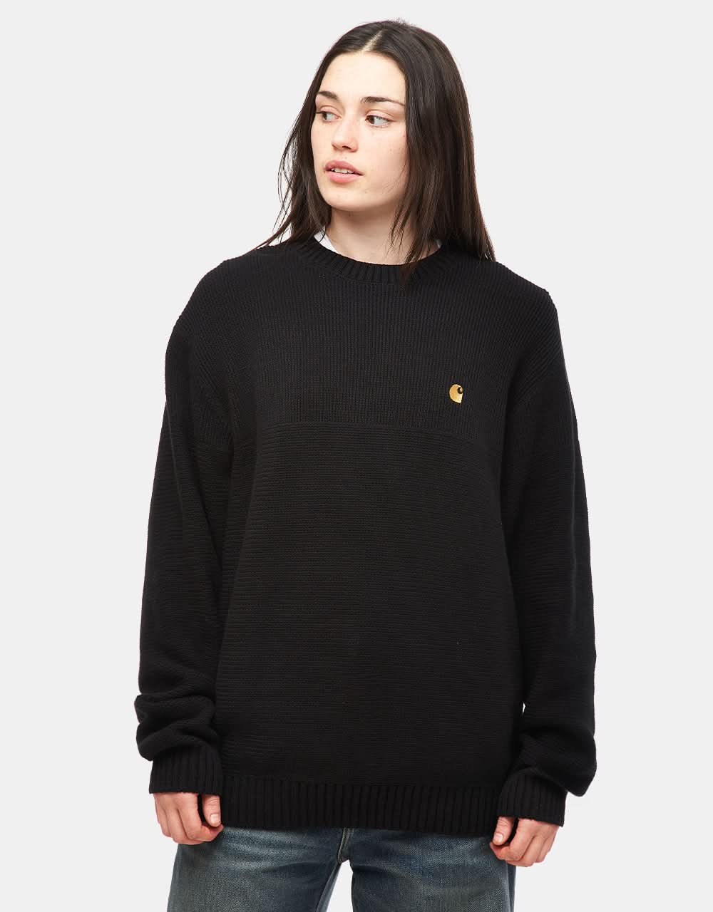 Upgrade your wardrobe with the Carhartt WIP Chane Sweater in Black/Gold, a timeless addition to your knitwear collection. This skater sweater features a small embroidered Carhartt logo on the left front chest, making it a stylish choice for any casual outing. This Carhartt WIP sweater is a must-have for your rotation.