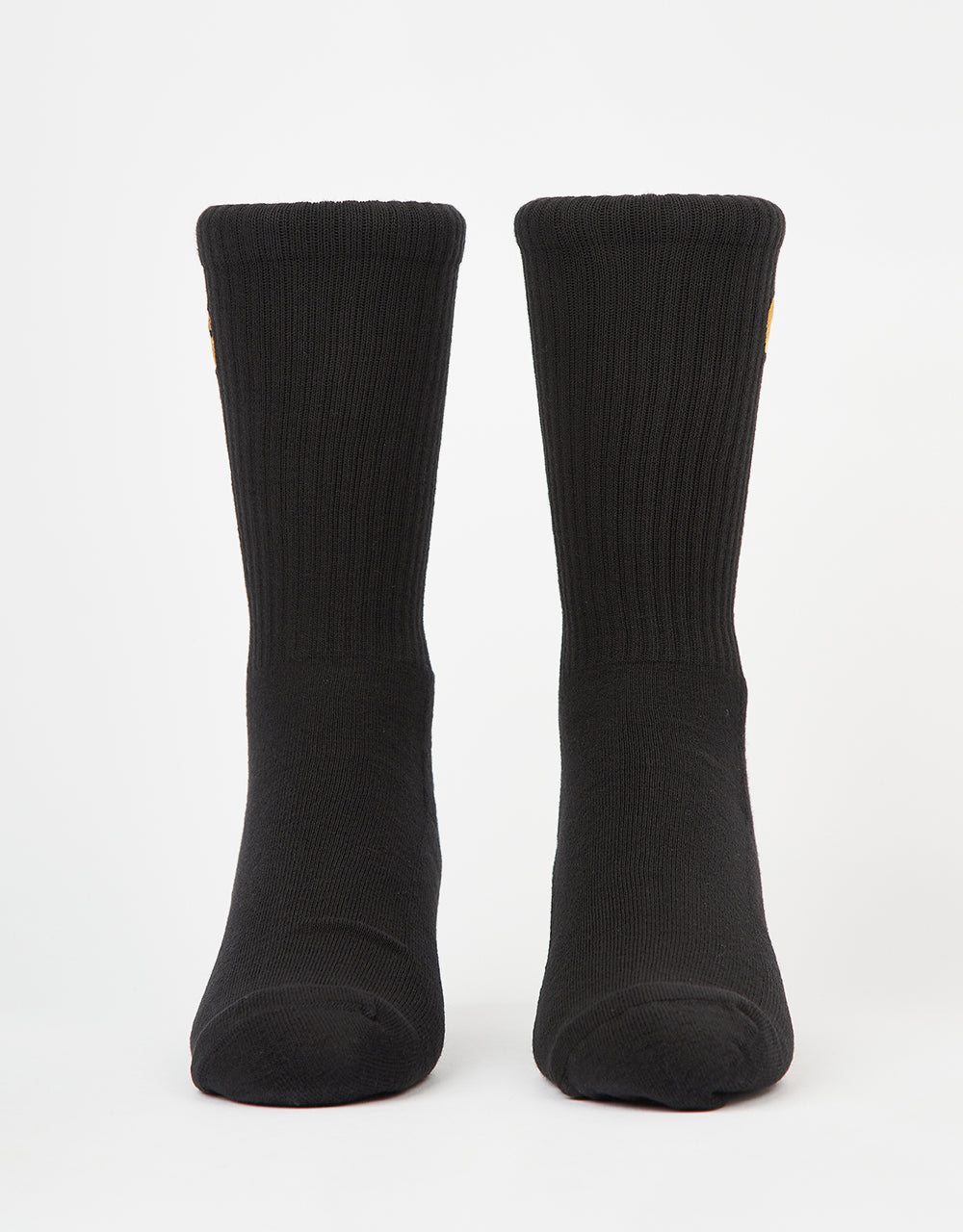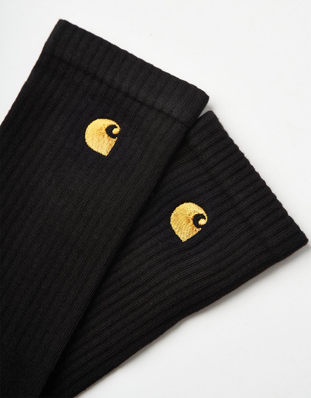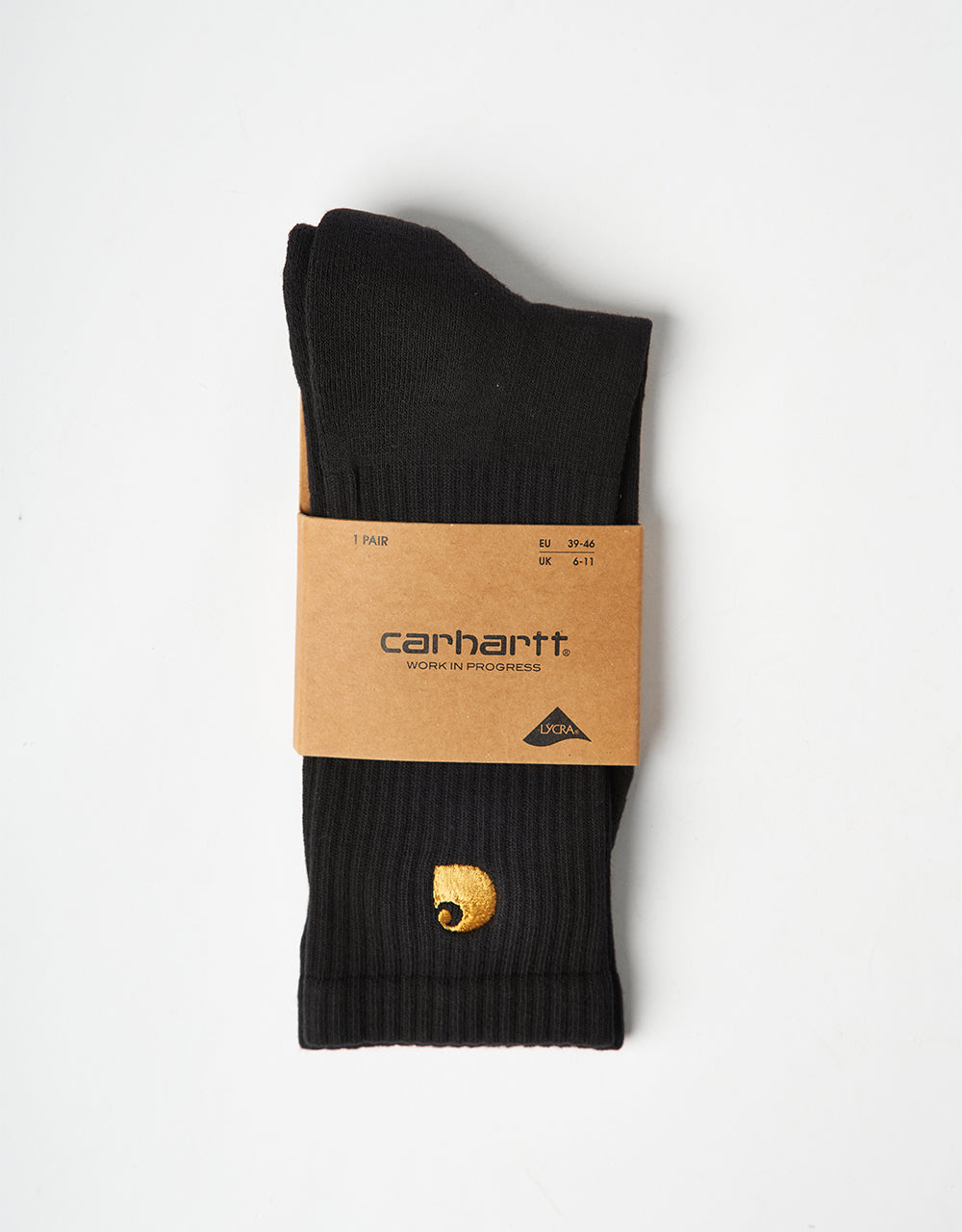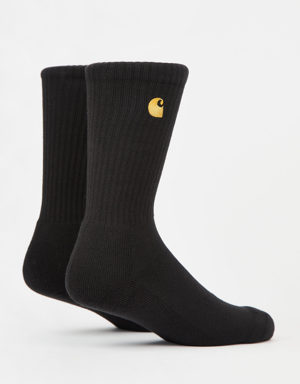 The Carhartt Chase Socks in Black/Gold are an anatomically shaped crew sock designed for comfort and style. These versatile Carhartt socks feature ribbed ankles and embroidered Chase logos, making them perfect for everyday wear or as skater socks. The French terry at the interior sole panels adds extra comfort, ensuring your feet feel great all day long.