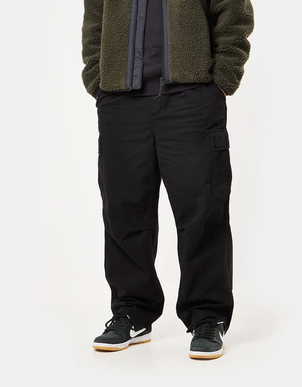 The Cole Cargo Pant in Black is a loose-fitting Cargo Pant from Carhartt WIP. Making the transition from workwear to streetwear effortlessly, Carhartt bring the resilient and functional qualities of dynamic service wear to the everyday-wear space. The Cole is crafted from 100% organic cotton to perfectly match comfortable wearing with lasting durability, and features a sweet selection of diverse pocket options like spacious cargo pockets at the legs and two discreet rear welt pockets for stashing the essentials. Finished with a classic zip fly and button fastening, the Cole is a great everyday go-to for those constantly on the move.