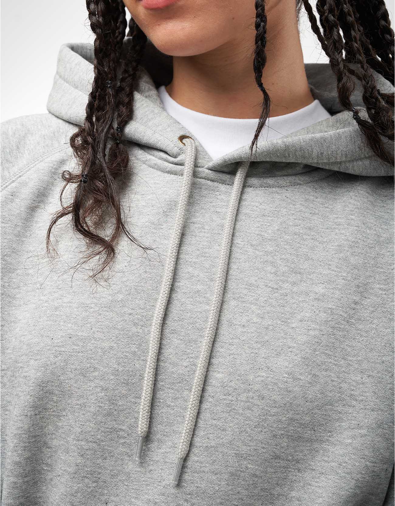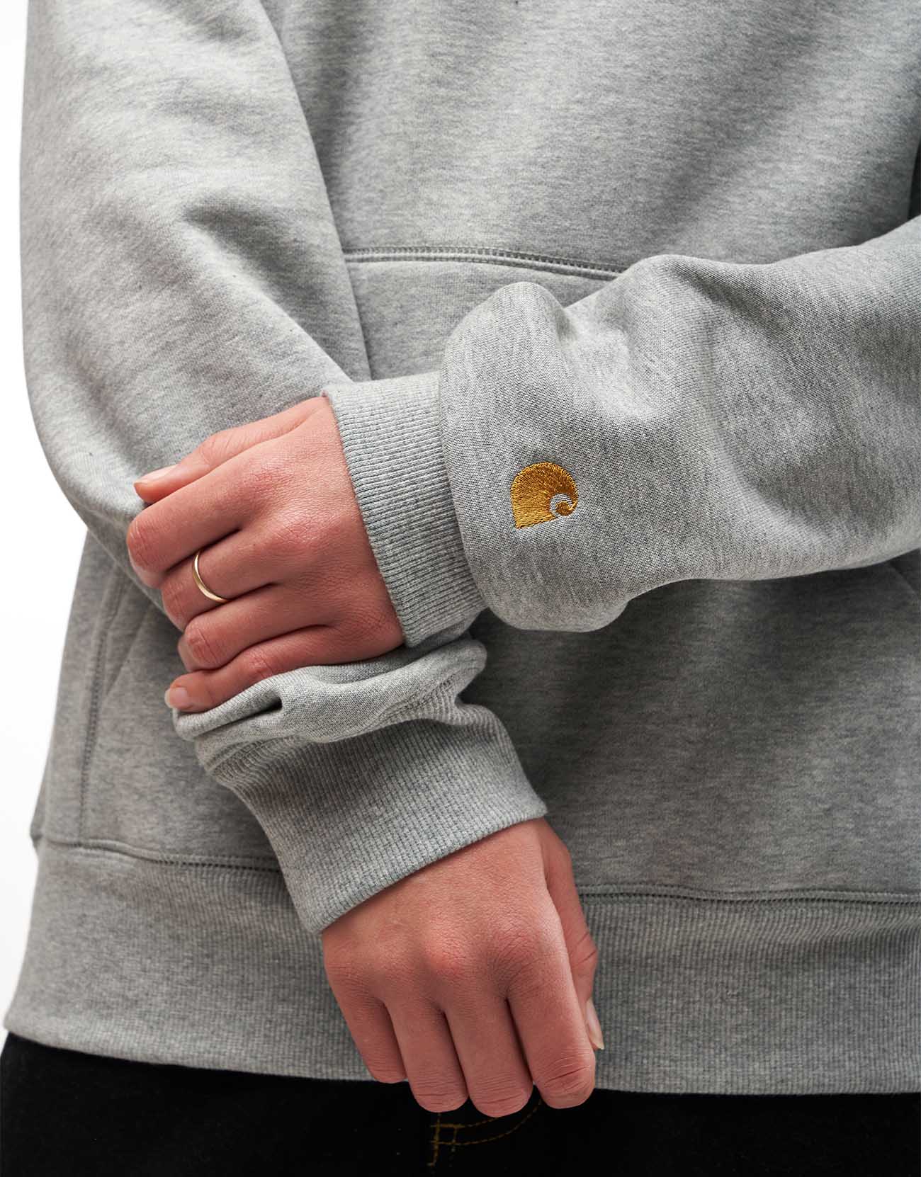 Upgrade your wardrobe with the Carhartt WIP Hooded Chase Sweatshirt in Grey Heather/Gold, a timeless addition to your collection of Carhartt hoodies. This hoodie features a small embroidered Carhartt logo at the bottom of the sleeve, making it a stylish choice for both casual wear and skate hoodies. This unique Carhartt WIP hoodie is a must-have for your rotation.