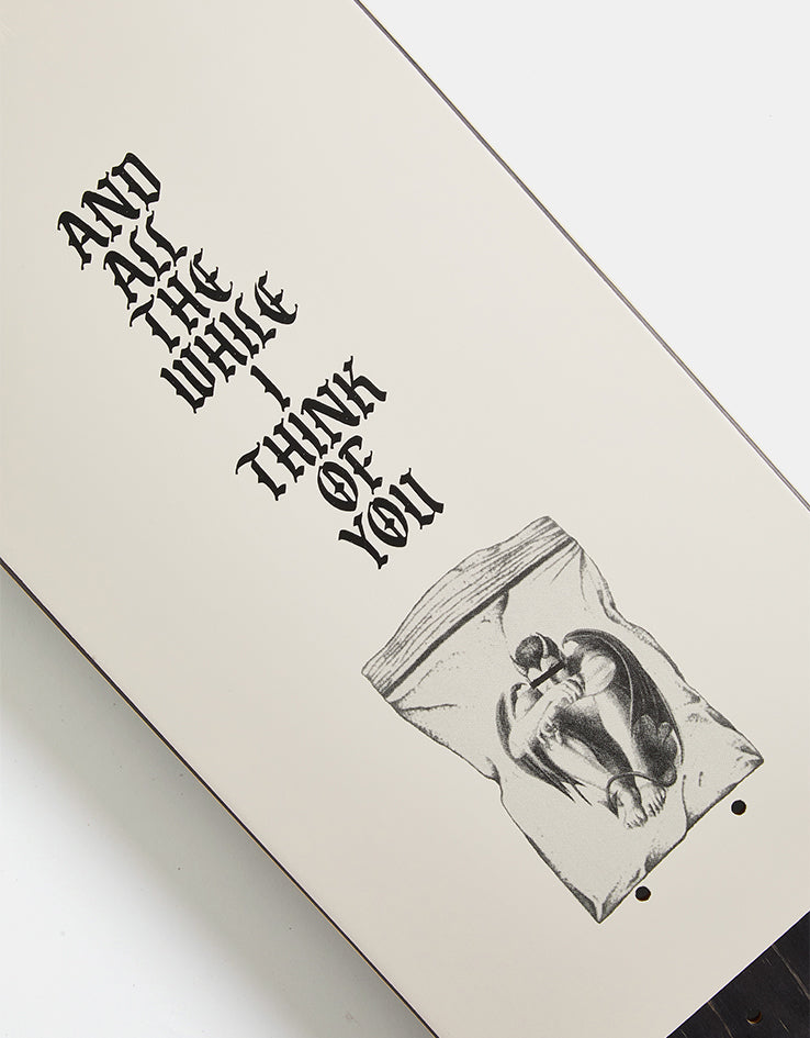 The Chocolate Trahan White Lines G052 Skateboard Deck in a pro model for Jordan Trahan coming in at 8.25" wide. The deck features a winged demon sat in a baggy, beneath the words 'and all the while I think of you' on a white and black veneer split background.