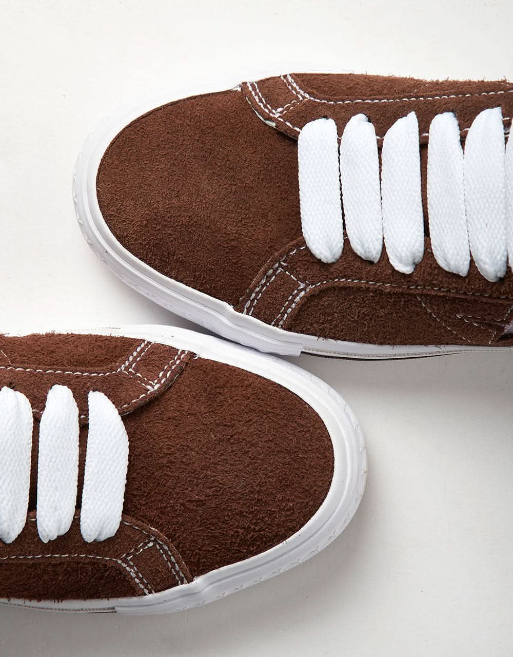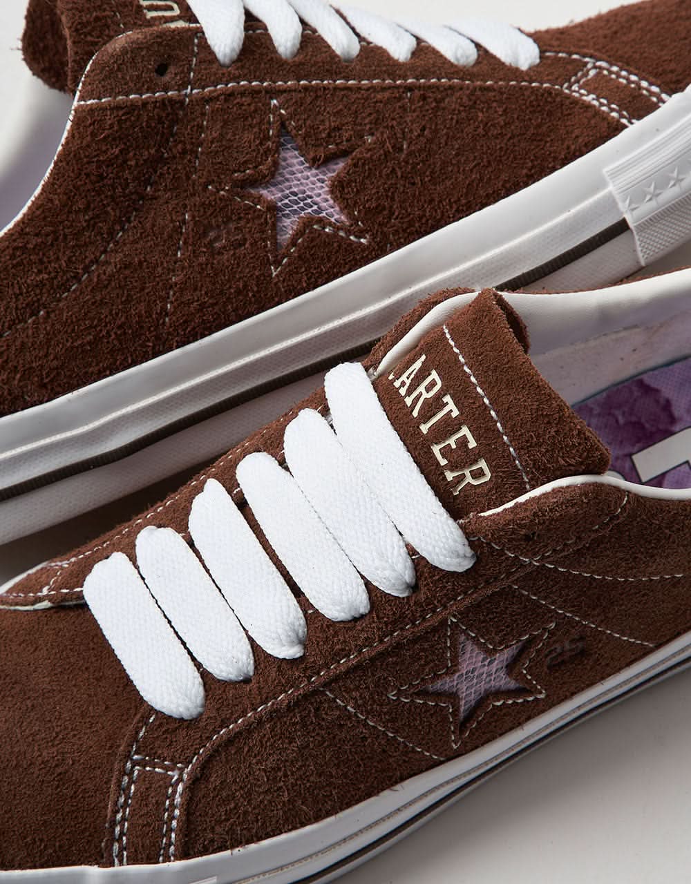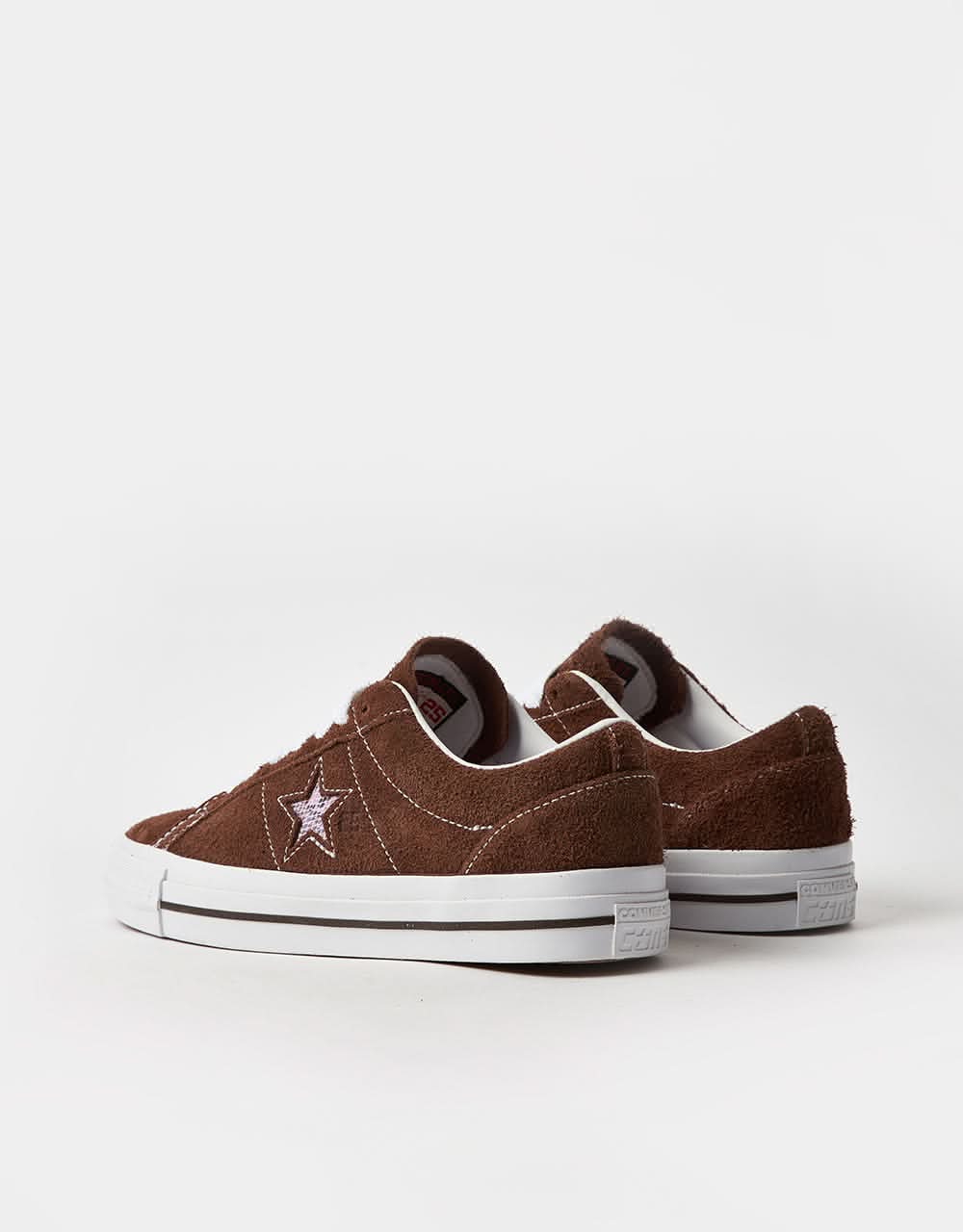 The Converse One Star Pro Skate Shoes are an exceptional update on a classic silhouette. With skating at the forefront of their vision, these take protection and comfort to the next level. Inside there's a white padded collar, cotton lining, and a padded innersole with a cotton footbed. Built on a light gum rubber vulcanized sole, with a Black sidewall, sidewall stripe, a Black heel tab with embossed Converse Cons branding and topped with a brown suede upper and Quatersnacks branding dotted amongst the shoe.