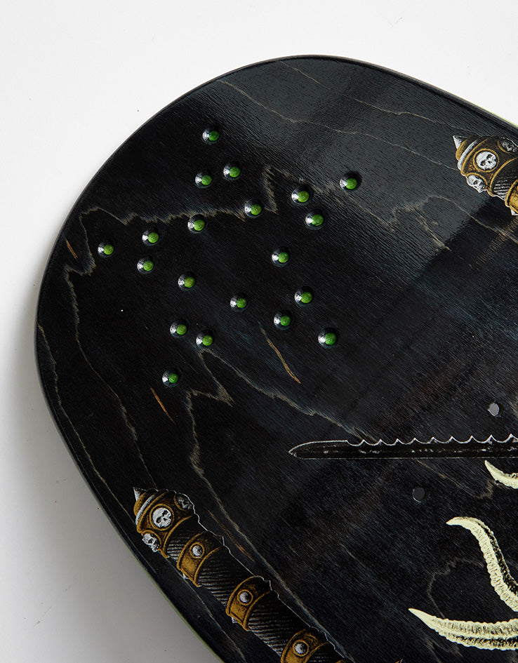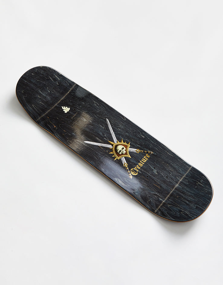 The Creature Hitz Serrator Skateboard Deck is a pro model for Sam Hitz coming in at 9" wide. The deck is Sam's 9" signature 9" Slab shape, upgraded for the first time with inverted 'Serrations" and "Penta-Grip" technologies for those who are inclined to grab. The graphic is a serrated-blade wielding metallic knight.
