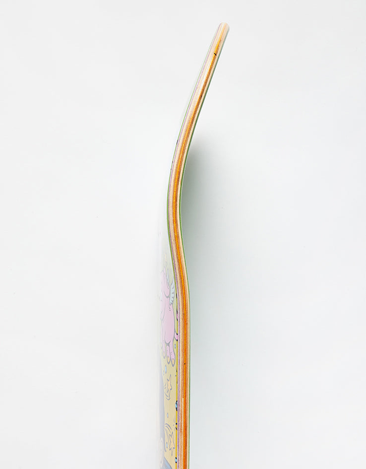 Entering the brand's spirt month, Deathwish lean fully into the dark with a release of typically creepy hardware. The Deathwish O'Dwyer Low Life Kids Skateboard Deck is a pro model for Brian O'Dwyer coming in at 8.38" wide. The deck features an illustrated child version of Brian getting tipsy surrounded by barrels and flying pink elephants. Deathwish branding sits on the nose and 'Buzzed Brian' on the tail.