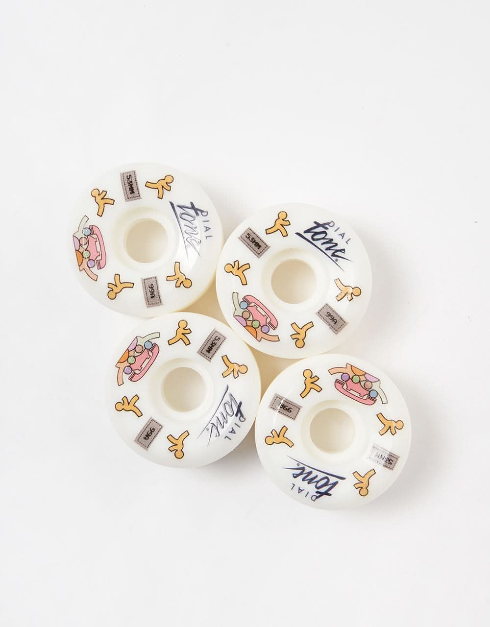 Theories of Atlantis' urethane specialists, Dial Tone Wheels, drop a fresh load of tyres for Summer '24. The Dial Tone AOL Conical Standard Skateboard Wheels is a team wheel that use 99a urethane with a conical cut. Coming in at 53mm, the wheel features a simple graphic of stick people running and in front of a phone, in the brand's classic 90s vibe. Dial Tone branding features on the graphic side, with the reverse side staying blank.