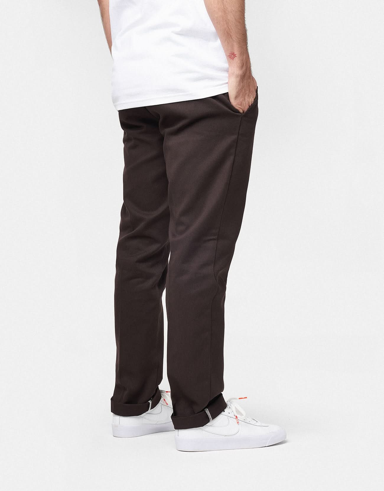 The Dickies 872 Slim Fit Work Pants in Dark Brown are a slightly slimmed down, more fitted version of the classic 874. The low rise sits just below the waist and the softer, less stiff, newly recycled material makes for all day comfort. These fit true to size, however, if you are on the cusp of two sizes then we recommend choosing a size up.