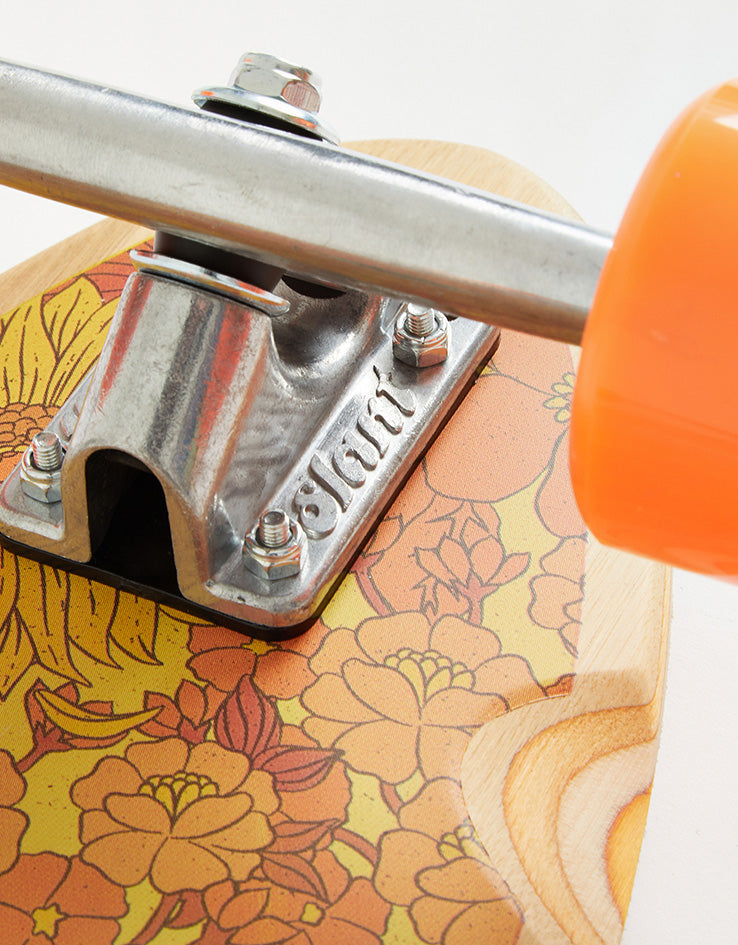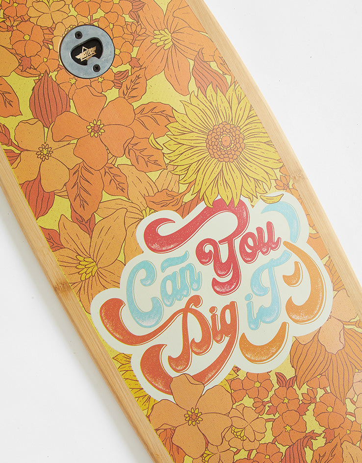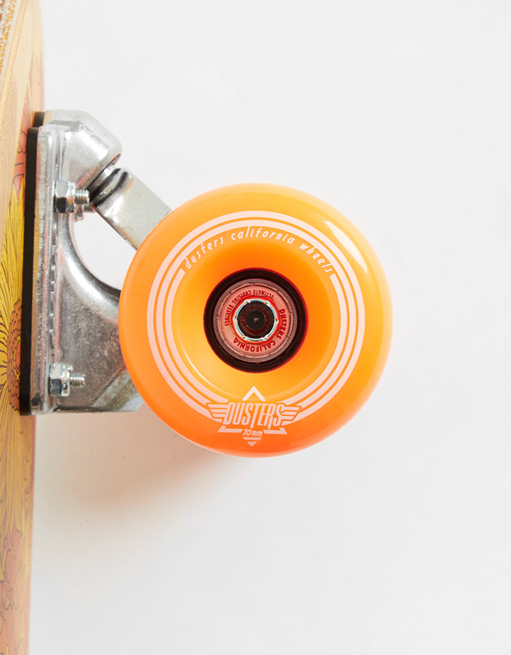 The Dig It Pintail Longboard from Dusters comes set up and ready to get skating straight away. The 9" Dusters deck features flowers down the length of the board with text in the centre reading 'Can you Dig It?'. The board comes with Slant 180mm reverse kingpin trucks, Dusters 70mm 78a Wheels and Dusters Abec 7 Bearings, meaning it is perfect for cruising the streets.