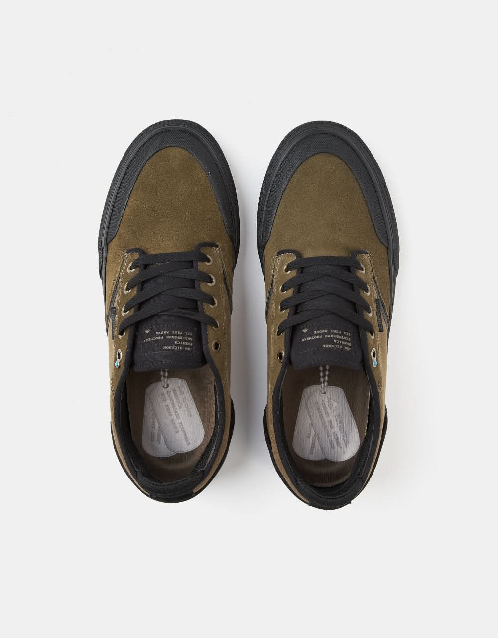Jon Dickson's first Emerica Pro model gets a new OD Black colourway in collaboration with Six Feet Above. Featuring a Flick shield toe reinforcement for added durability, while also having double wrapped foxing and a polyurethane G6 insole for impact resistance with custom artwork by Jon Dickson himself.