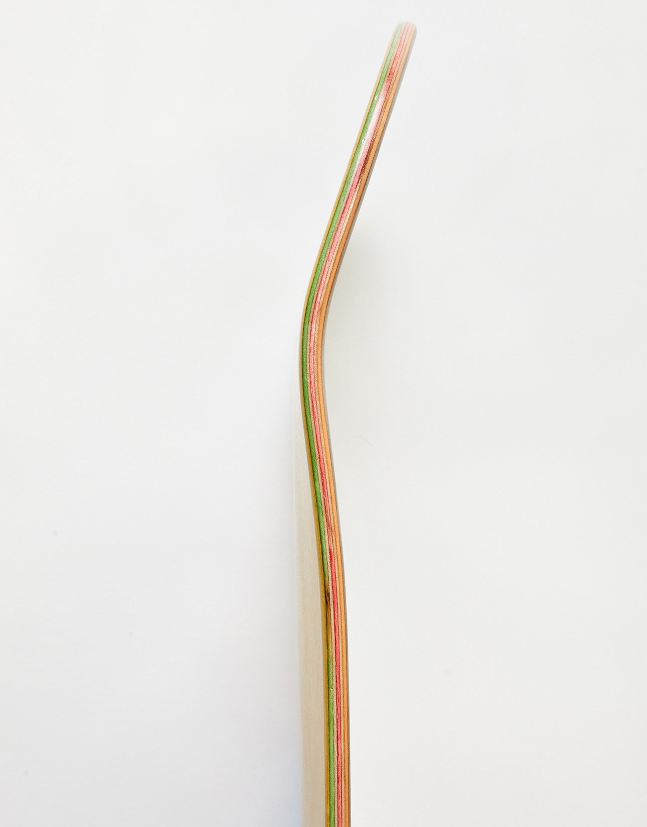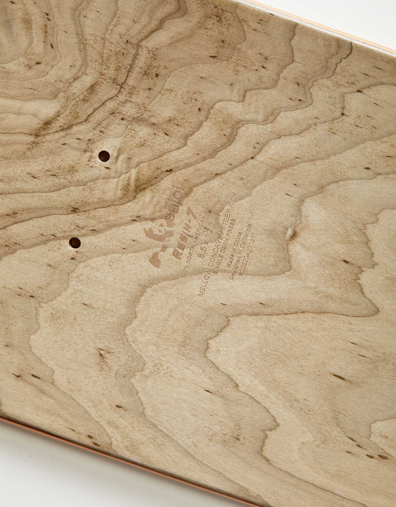 Caswell Berry's Auto Zone pro model deck for Enjoi Skateboards features a blend of printed artwork and traditional stained woodgrain for a standout effect. An illustration of a hot dog car sits centrally, and the board is constructed using Resin-7 for more strength and a lighter makeup than traditional 7-ply decks.
