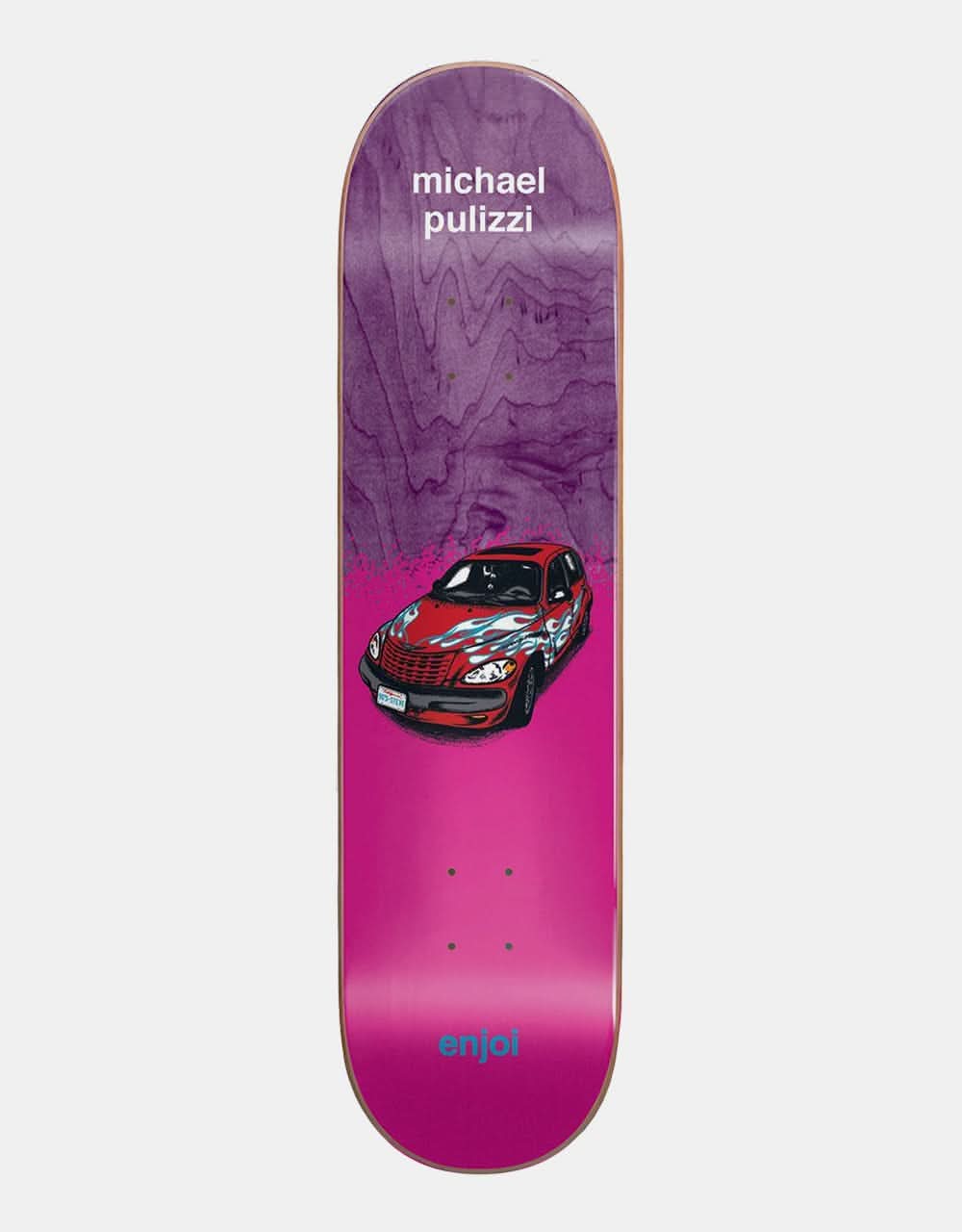 Michael Pulizzi's Auto Zone pro model deck for Enjoi Skateboards features a blend of printed artwork and traditional stained woodgrain for a standout effect. An illustration of a PT Cruiser sits centrally, and the board is constructed using Resin-7 for more strength and a lighter makeup than traditional 7-ply decks.