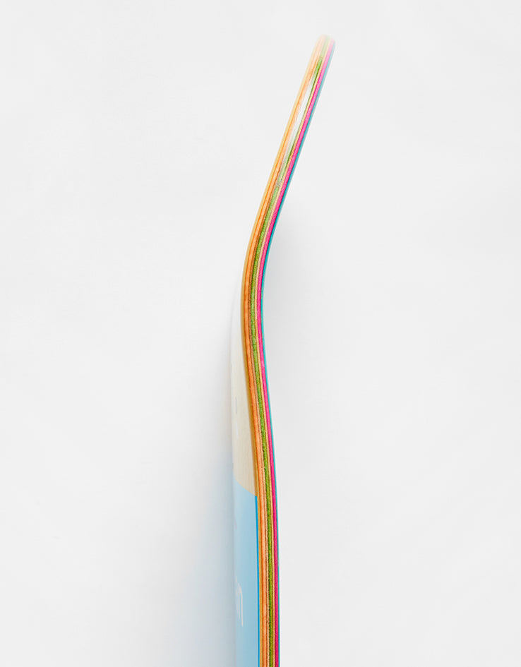 Thaynan Costa's High Waters pro model deck for Enjoi Skateboards features an unusual graphic layout, moving the primary focal point to the nose of the board which sports cartoon artwork against a wood stain background for a multi-dimensional effect. The rest of the board has a simple block colour, and is constructed using Resin-7 for more strength and a lighter makeup than traditional 7-ply decks.