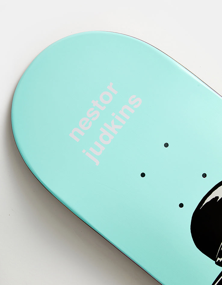 The Enjoi x WWE Judkins Body Slam R7 Skateboard Deck is a pro model for Nestor Judkins coming in at 8" wide. The deck features a cartoon depiction of the Undertaker on a blue background.