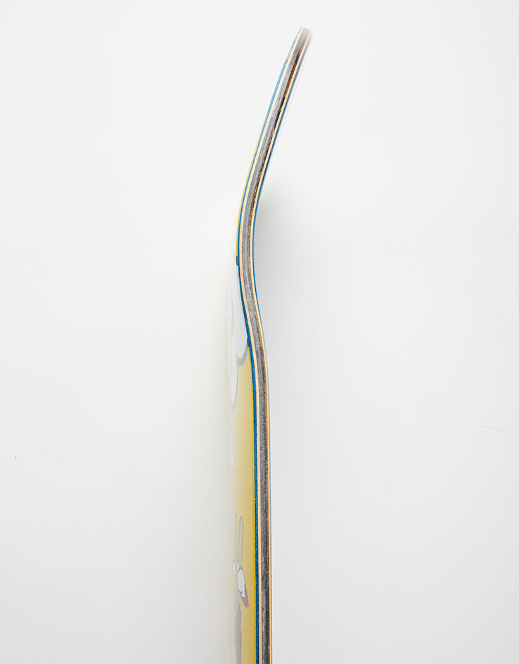 The Flip Team Bubbles Really Sorry 20th Anniversary Skateboard Deck is a team board which features a cartoon monkey blowing smoke on a yellow background.