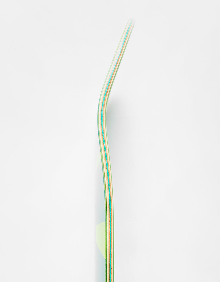 Andrew Brophy's Rising board from Girl features Girl branding printed in a large font up the length of the board with a split colour background.