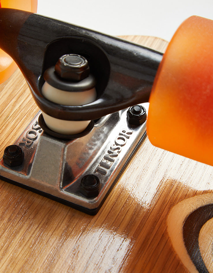 The Globe Blazer White Oak Cruiser Skateboard is a mini diamond-tail cruiser with soft conical wheels that comes fully set up and ready to hit the streets. Coming in at 7.25" wide the deck features a simple sunset graphic made from print and wood. It comes equipped with 4.25" Tensor alloy trucks, 62mm 78a Conical Cruiser Wheels, Abec 7 bearings and black and clear broadcast grip.