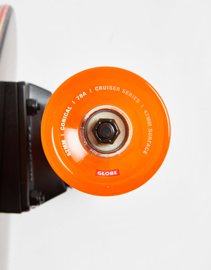 The Globe Chromantic Sea Devil Cruiser Skateboard is a medium-length surf inspired swallow-tail cruiser which is fully set up and ready to hit the streets. Coming in at 9.5" wide, the deck features a colourful graphic atop a contrasting black background. It comes equipped with 6" Tensor alloy trucks, 62mm 78a Conical Cruiser Wheels, Abec 7 bearings and split grip with top art