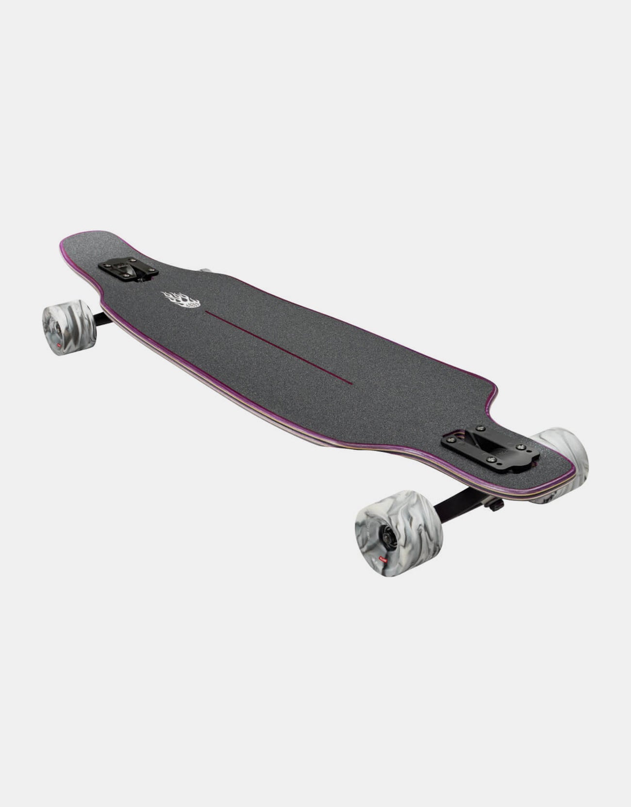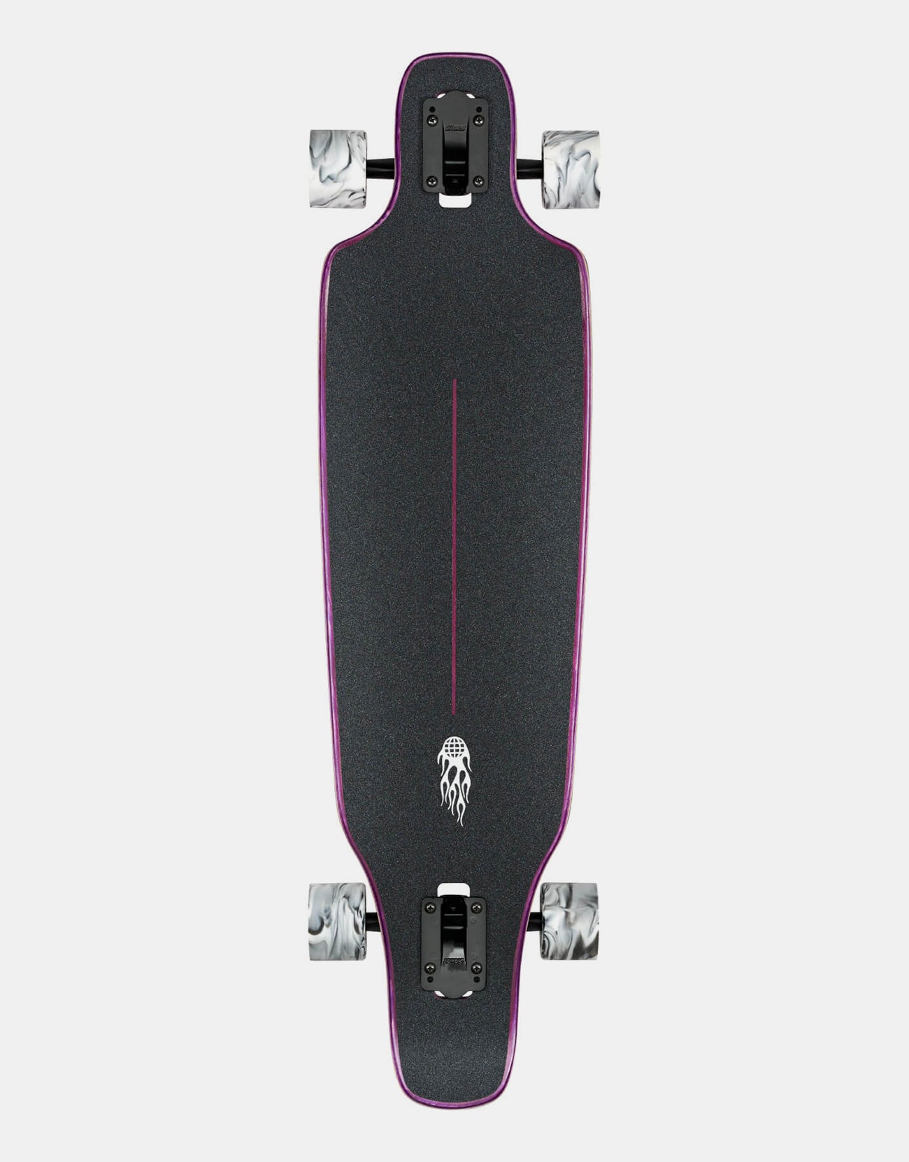 The Globe Outlier Flames Drop Through Longboard is a modified Cutler with wider tail and less tapered shape which is fully set up and ready to hit the streets. Coming in at 9.6" wide, the deck features a purple flame graphic atop a black background. It comes equipped with 180mm Slant reverse kingpin trucks, 70mm 78a Conical Cruiser wheels, Abec 7 bearings and black grip with top art.