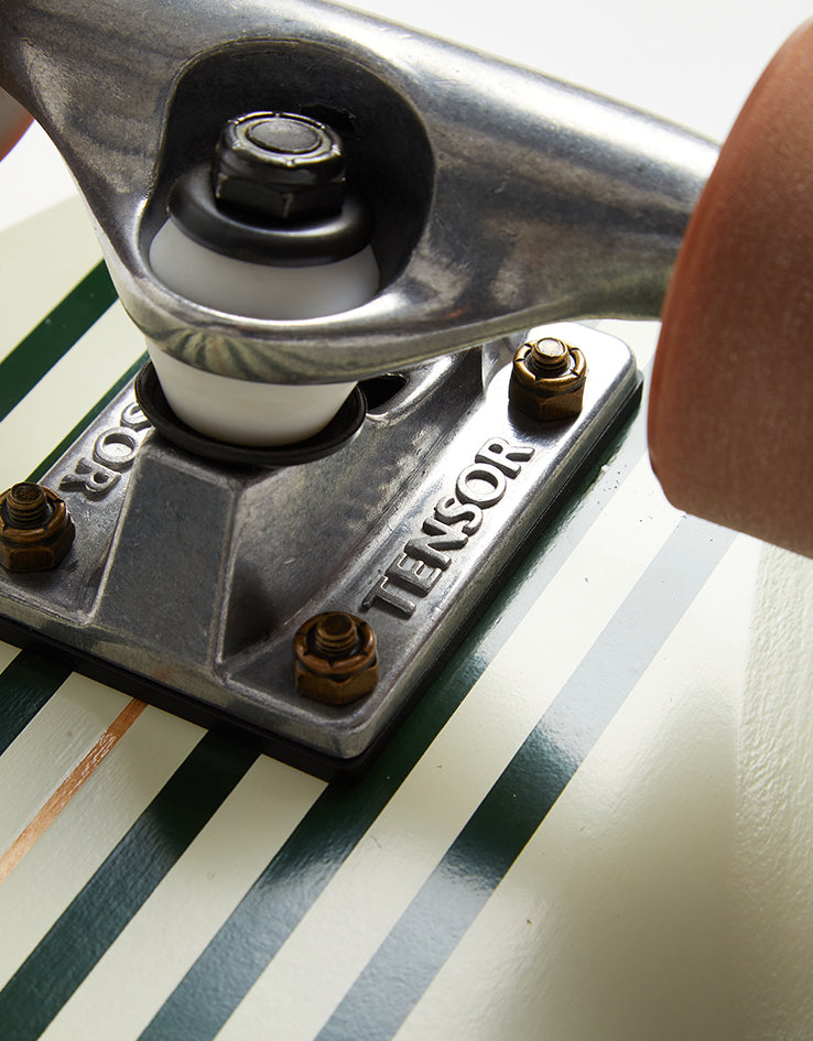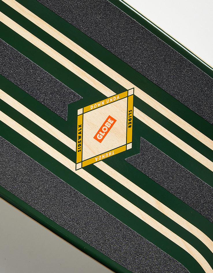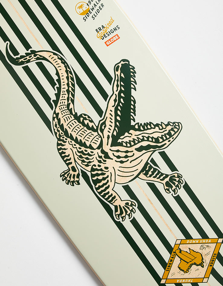 The Globe Sidewalk Slider Croc Cruiser Skateboard is fully set up and ready to hit the streets. Coming in at 8.25" wide the deck features a crocodile in the centre with green racing stripes below on an off-white background. It comes equipped with 4.25" Tensor alloy trucks, 58mm 85a Retro Flex Cruiser Wheels, Abec 7 bearings and Dei-cut griptape with top art.