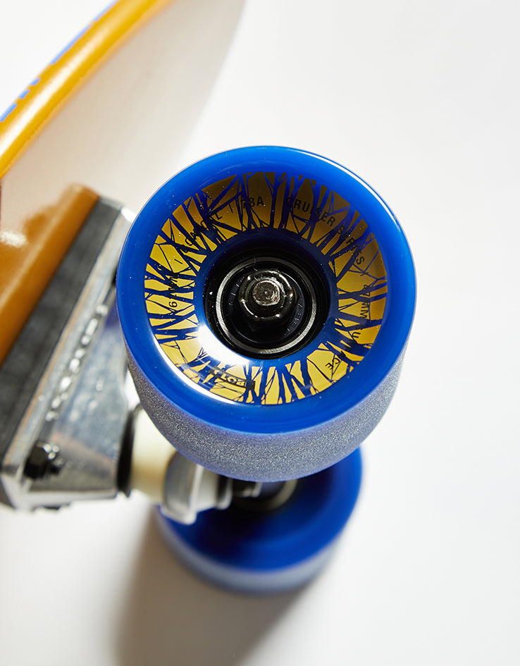 The Globe x Hirotten Blazer Lazer Wolf Cruiser Skateboard is a medium length diamond-tail cruiser with soft conical wheels that comes fully set up and ready to hit the streets. Coming in at 9.125" wide, the deck features art by Hirotton a wolf shooting lasers from its eyes in a bed full of grapes on an orange background. It comes equipped with 4.25" Tensor alloy trucks, 62mm 78a Conical Cruiser Wheels, Abec 7 bearings and Die-cut griptape with top art.