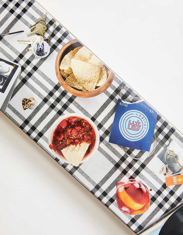 The Habitat Gillette Place Setting Skateboard Deck is a pro model for Austyn Gillette coming in at 8.25" wide. The deck features a table full of various food, drink and other items on a chequered table covering.