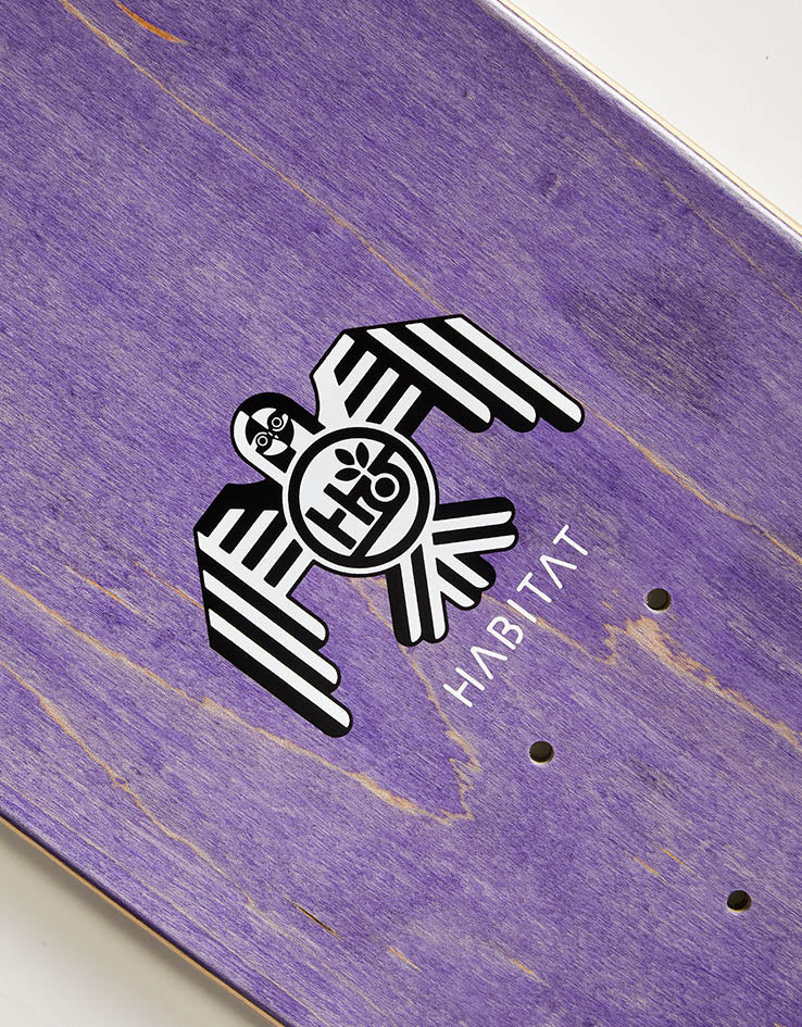 The Habitat Insecta Skateboard Deck is a team board coming in at 8" wide. The board features butterflies on the top half and repeated 'Habitat' text on the bottom half, with the logo in the centre on a white background.