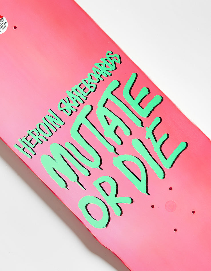 Heroin Skateboards come oozing out the wasteland with the Mutate or Die Pro Series. Straight from a barrel of toxic sludge, every shape in this lineup has been hit with dangerous levels of radiation, sprouting money bump mutations on all of the decks, even the popsicles.