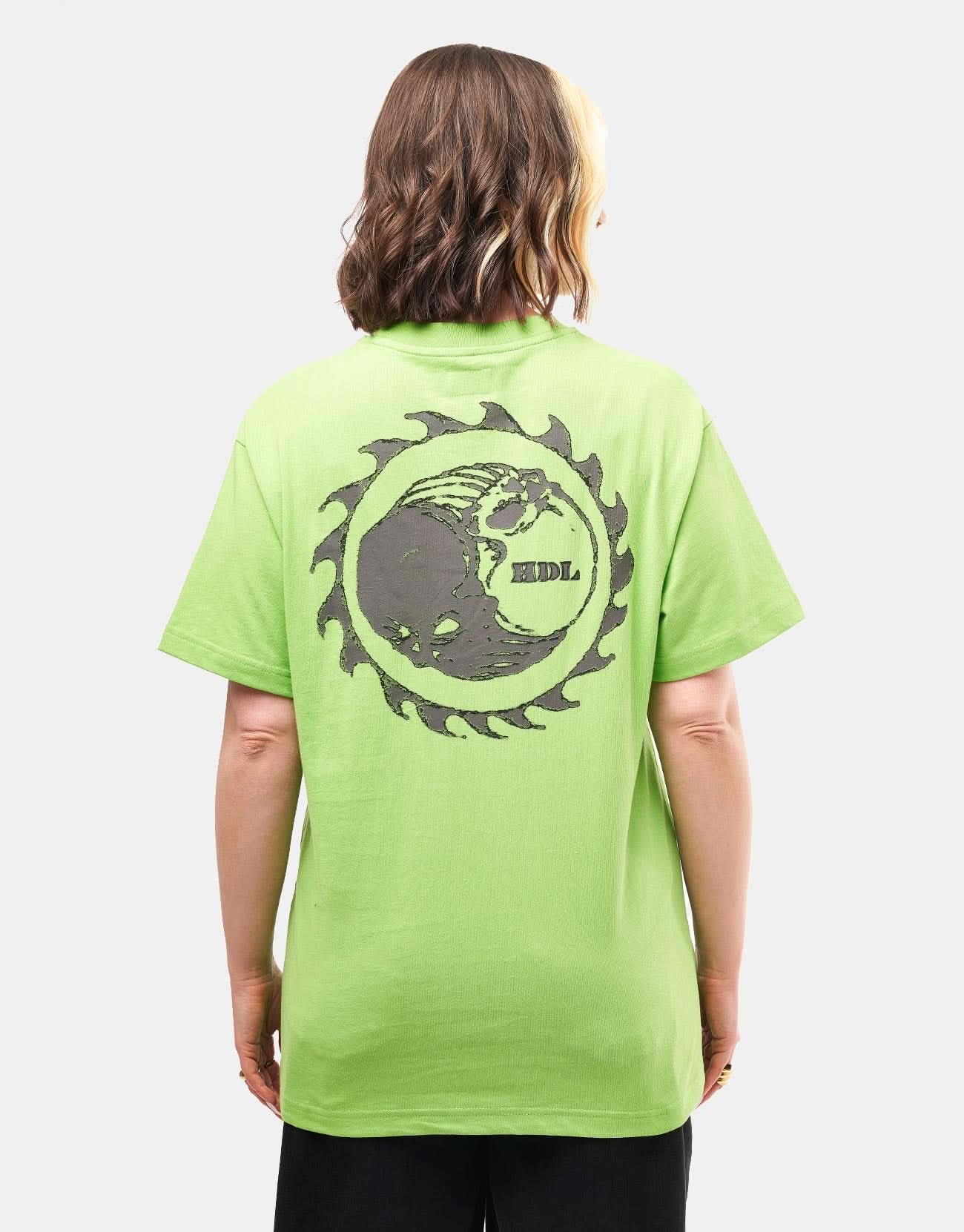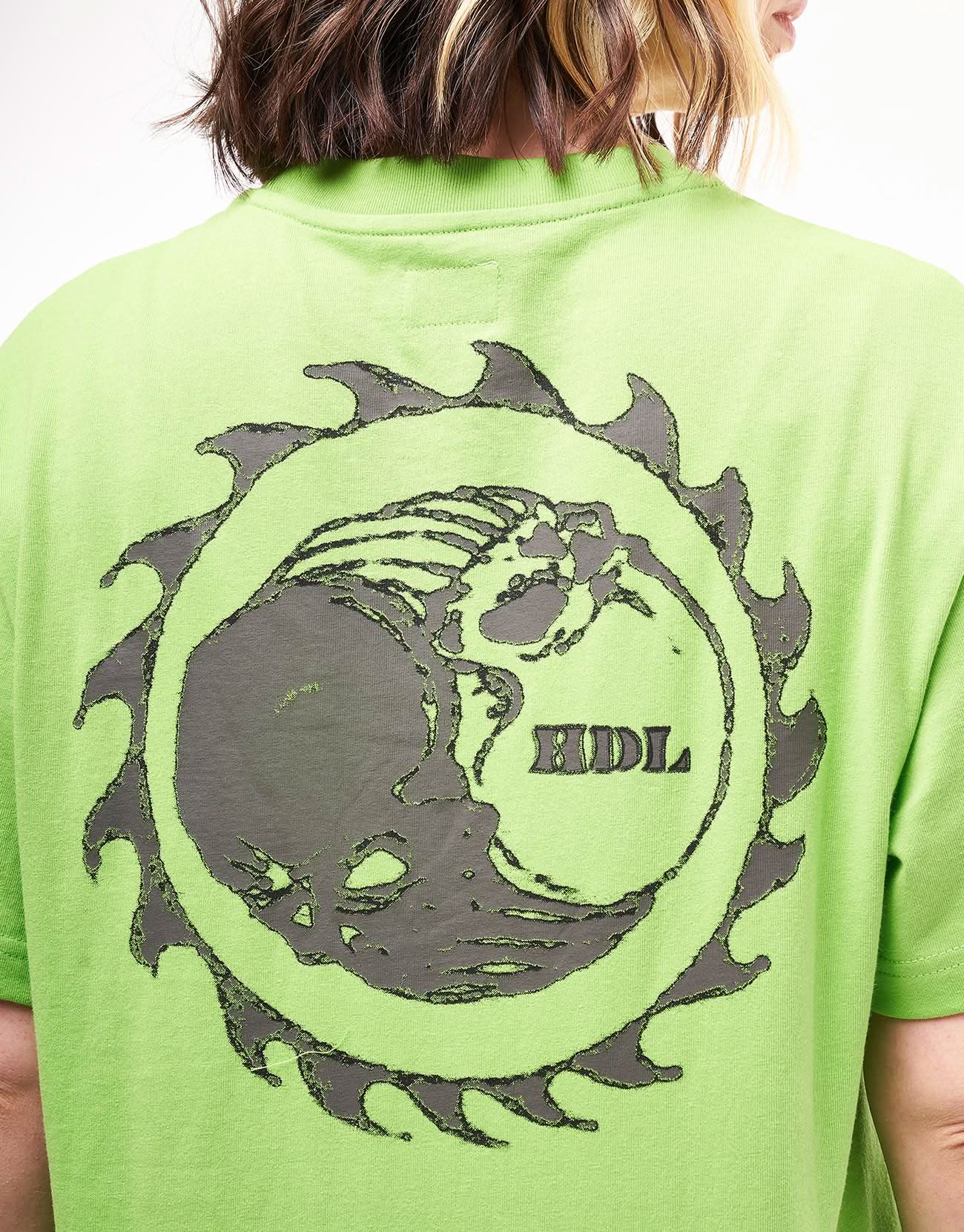 Upgrade your wardrobe with the Hoddle Thunderdome Pocket T-Shirt in Lime Green, an essential addition to everyday outfits. Composed of 100% cotton, styled in a relaxed fit with screen printed graphics on the front chest and back.