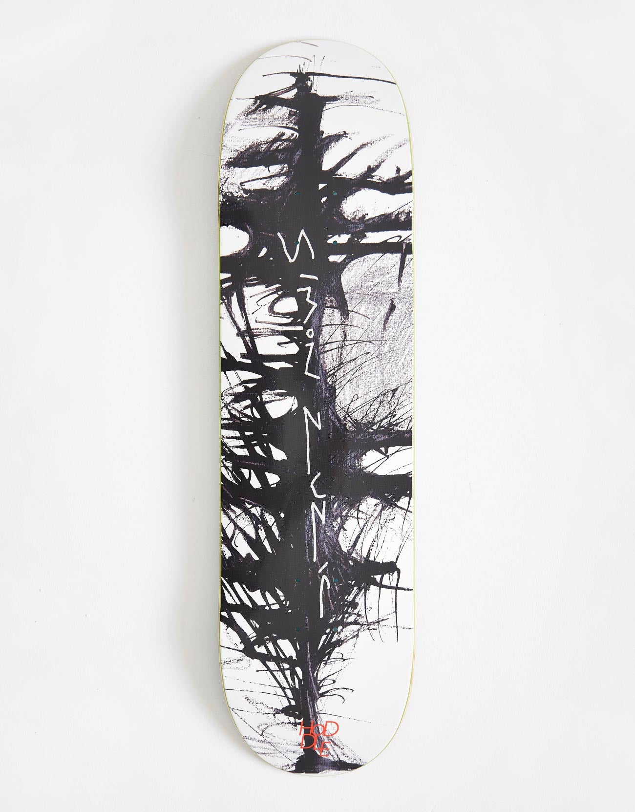 The Hoddle Zuzic Fracture Skateboard Deck is a pro model for Simon Zuzic coming in at 8.5" wide. The deck features a disturbing black ink sketch on a white background, with Hoddle branding on the tail.