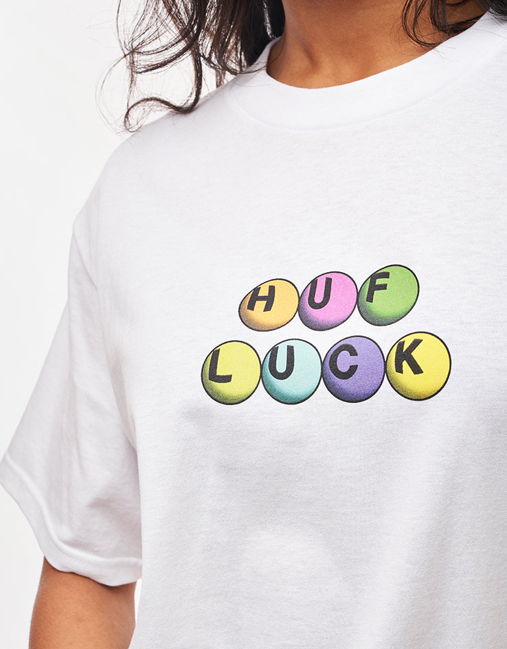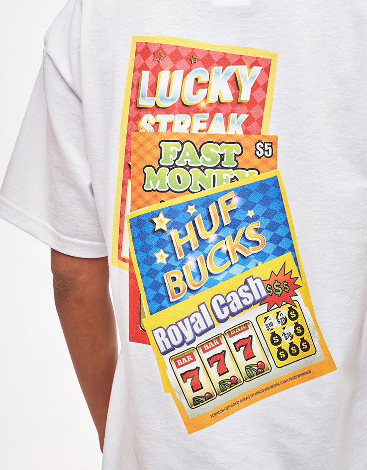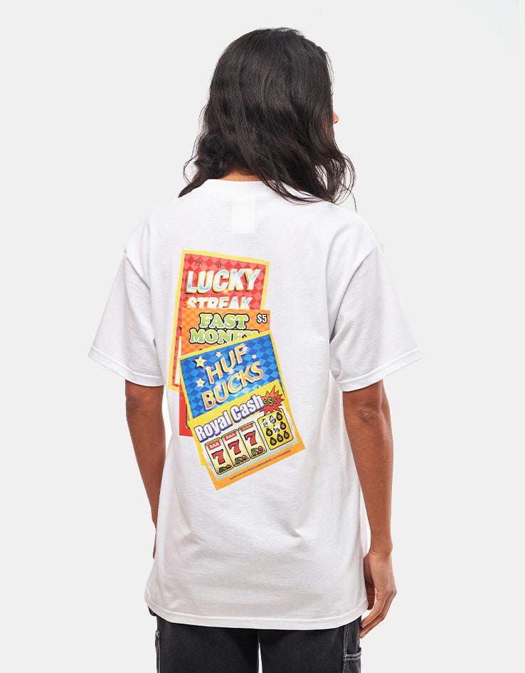 Upgrade your wardrobe with the HUF Lucky T-Shirt in White, a classic addition to any wardrobe. Composed of 100% cotton, featuring screen printed graphics on the front and back, styled in a relaxed fit. A timeless piece.