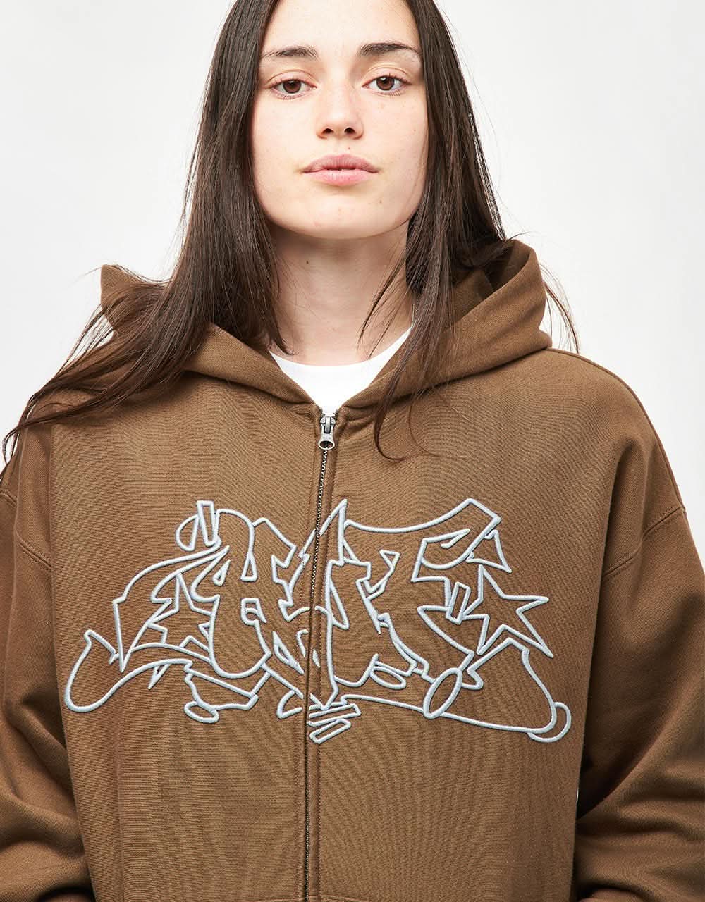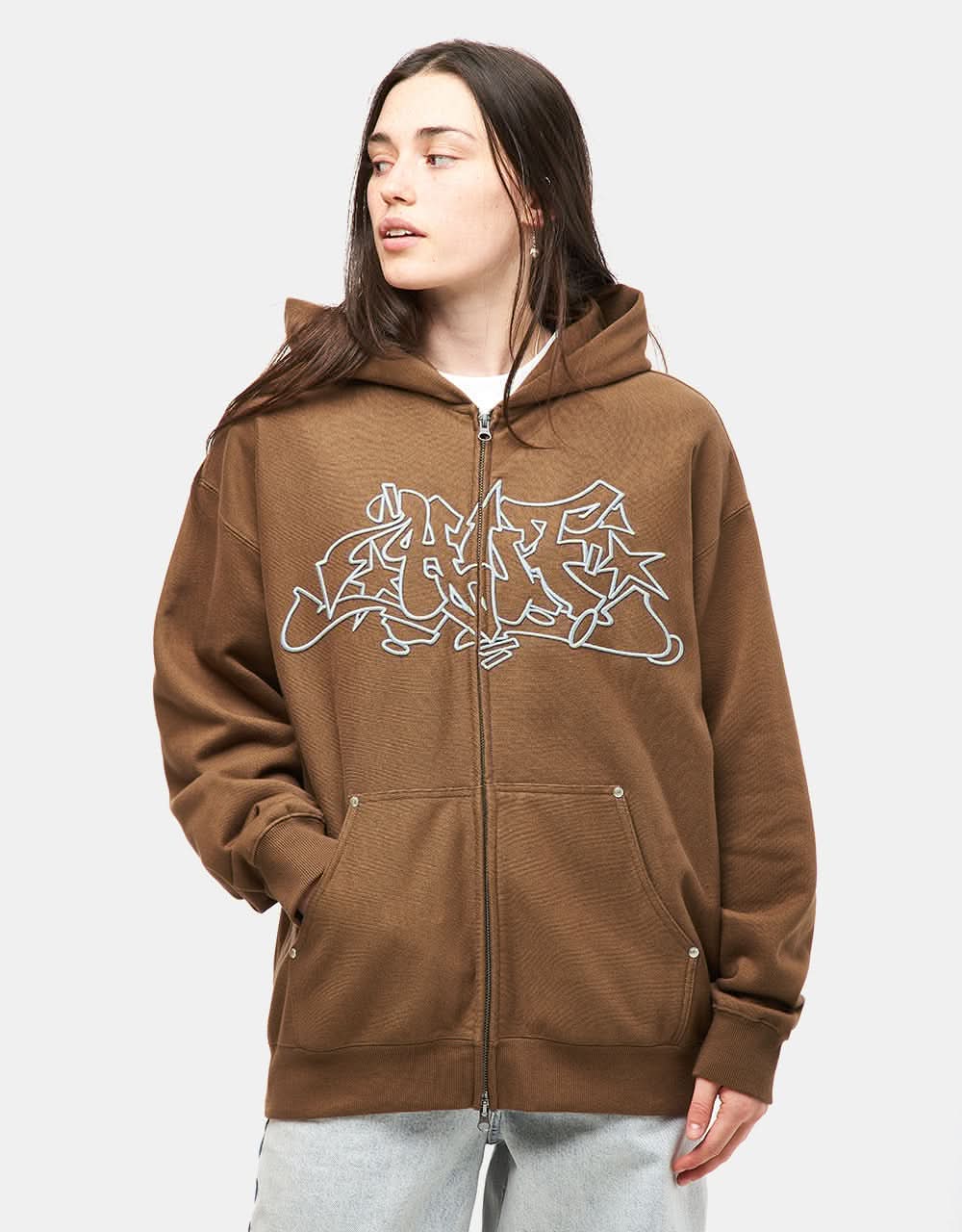 Upgrade your wardrobe with the HUF Outlines Heavy Weight Full Zip Fleece Hoodie in Brown, featuring classic branding from this iconic brand. Composed of a cotton blend, styled in a relaxed fit with embroidered graphics on the front chest.