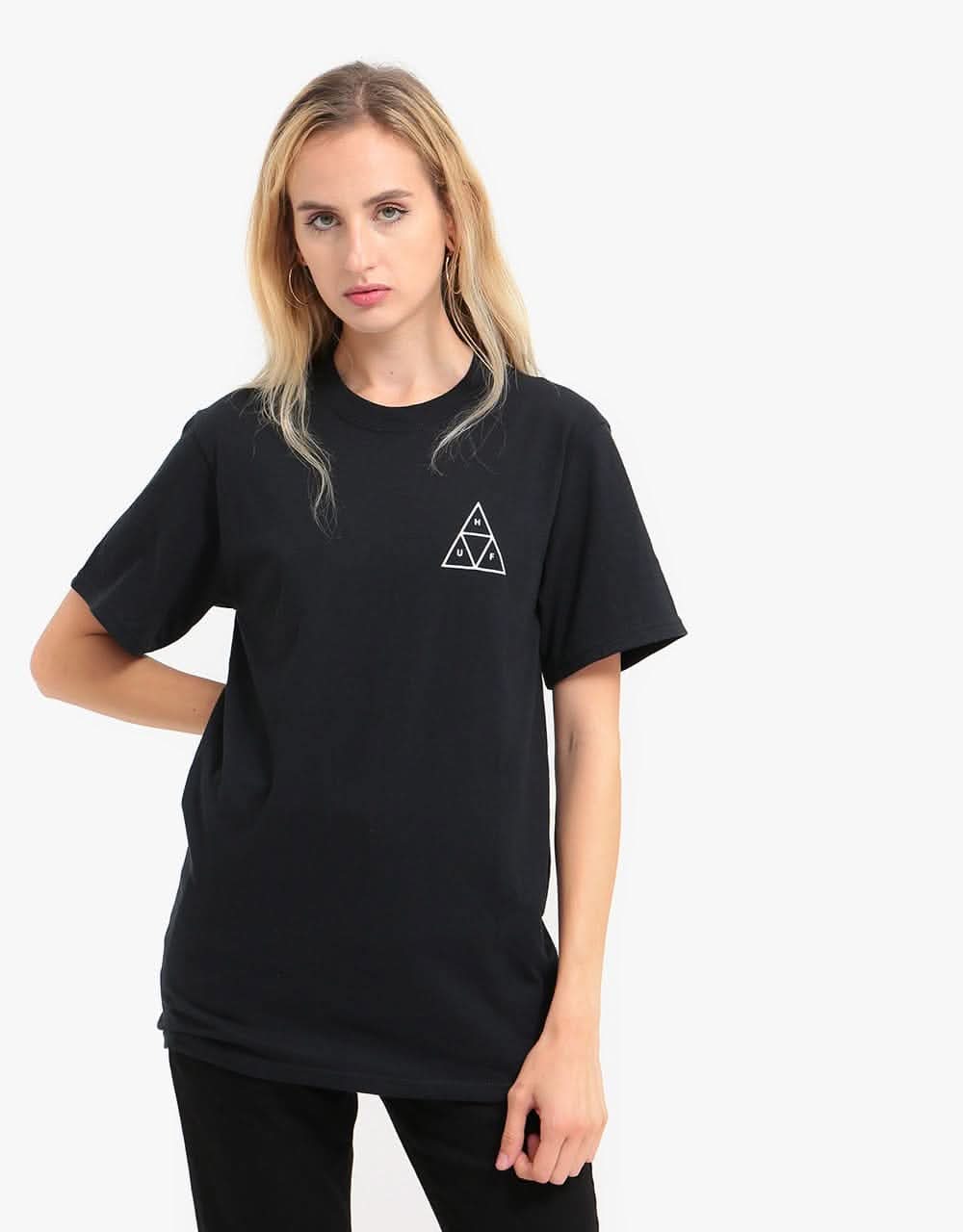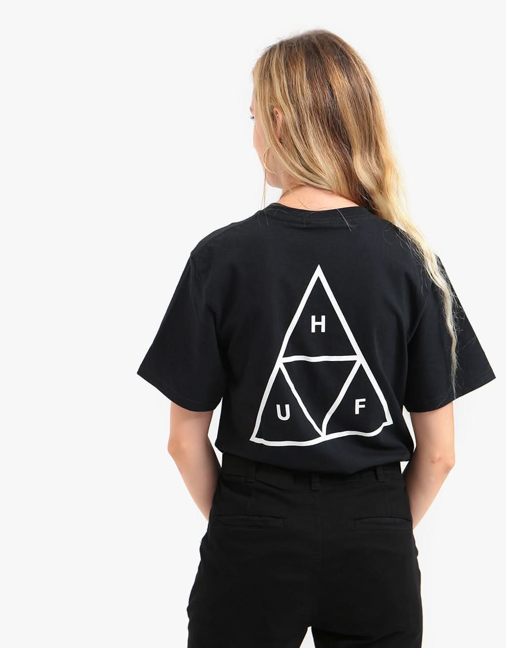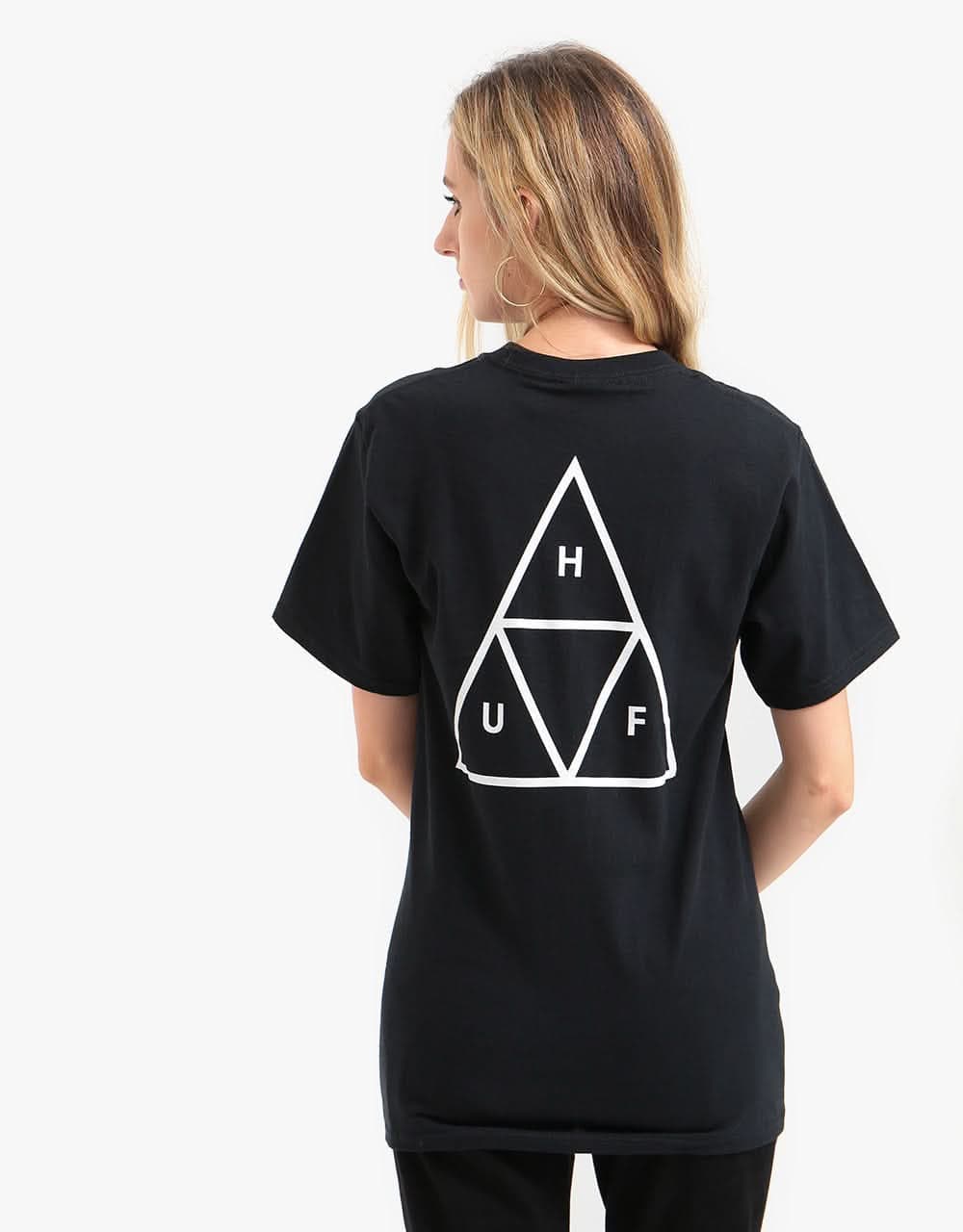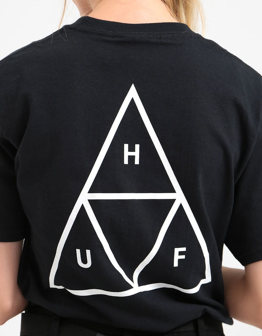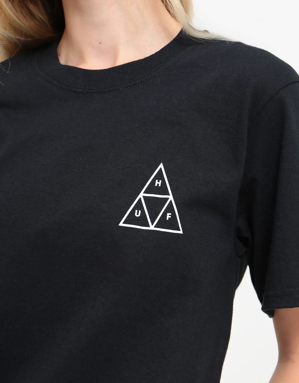 The HUF Triple Triangle T-Shirt is another hit from clothing and footwear heavyweights HUF, in black with a white Triple Triangle/HUF logo in small at the left chest and in large on the back, with 'By all means necessary//Worldwide DBC' text below it.