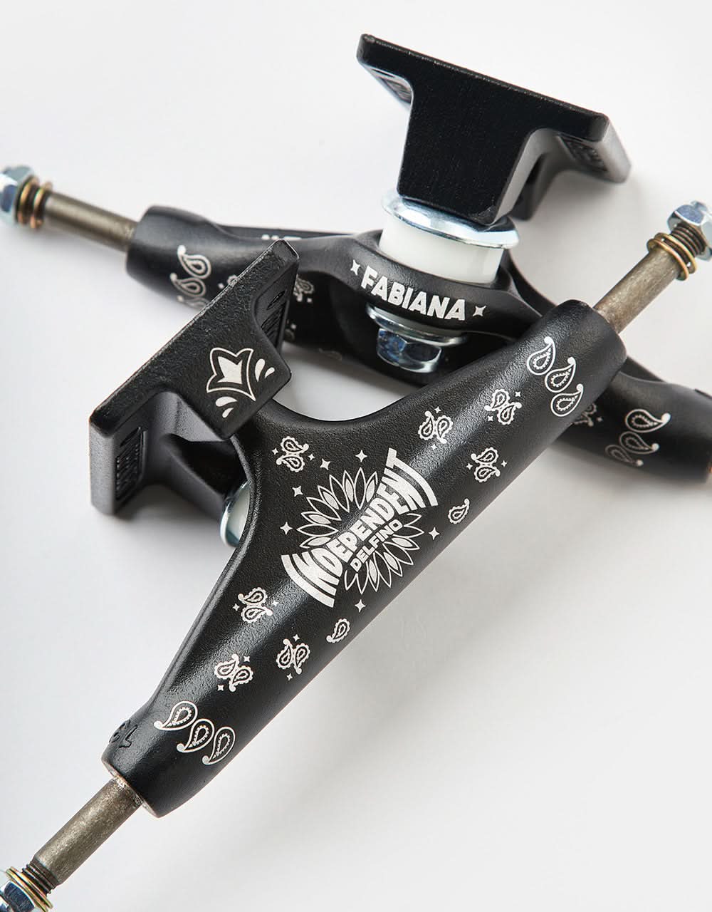 Treat yaself with Fabiana Delfino’s debut pro model truck from Indy. The skateboarding trailblazer lands a well-deserved signature truck from the best in the biz. Stage 11 hollows are fully adorned with bandana details across the hangar and baseplate, a nod to Fabiana’s headwear of choice.
