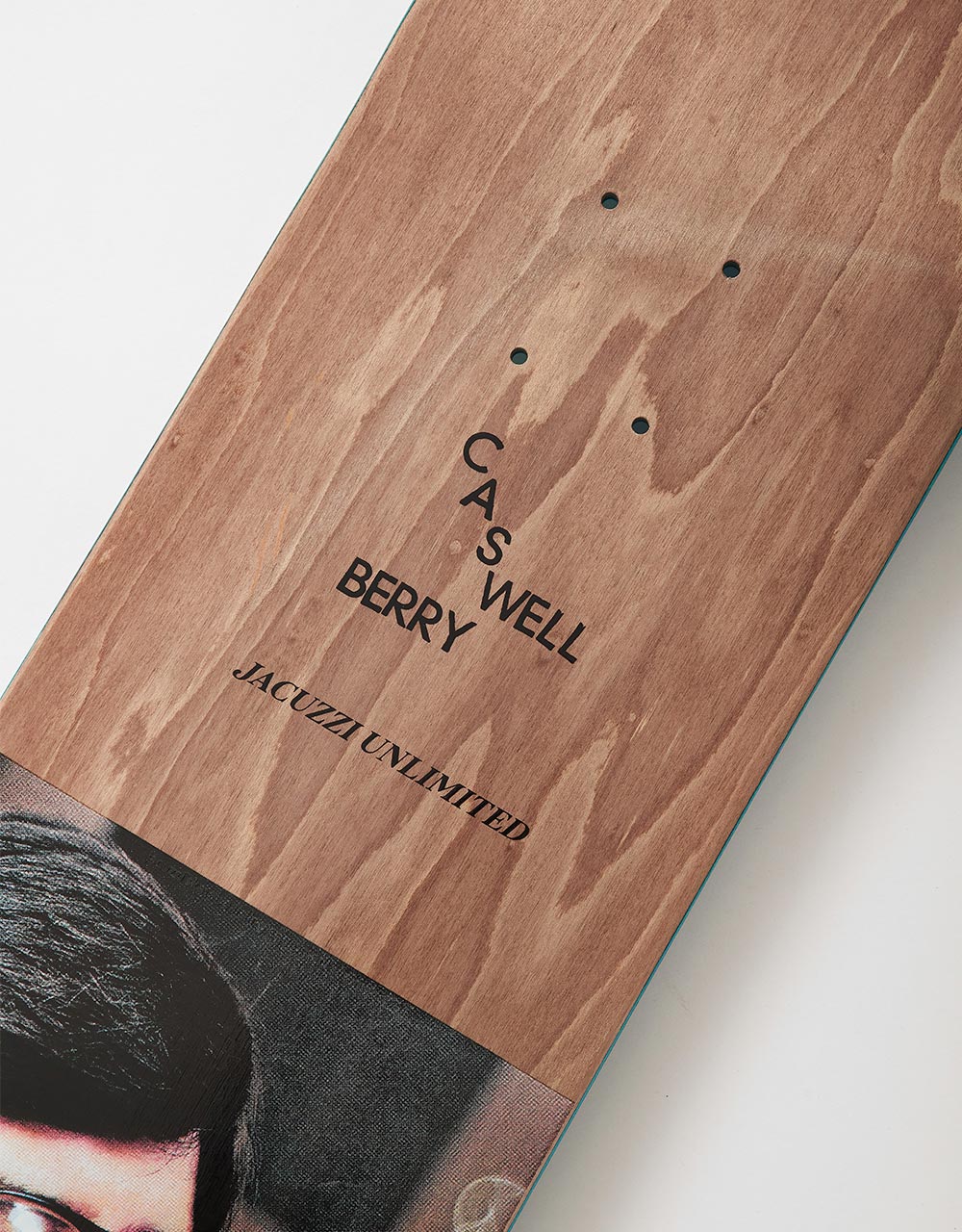 The Jacuzzi Unlimited Berry Smoke EX7 Skateboard Deck is a pro model for Caswell Berry coming in at 8.175" wide. The deck features a man in a shirt smoking several ciggies on the bottom half, and a wood veneer background on the top half.