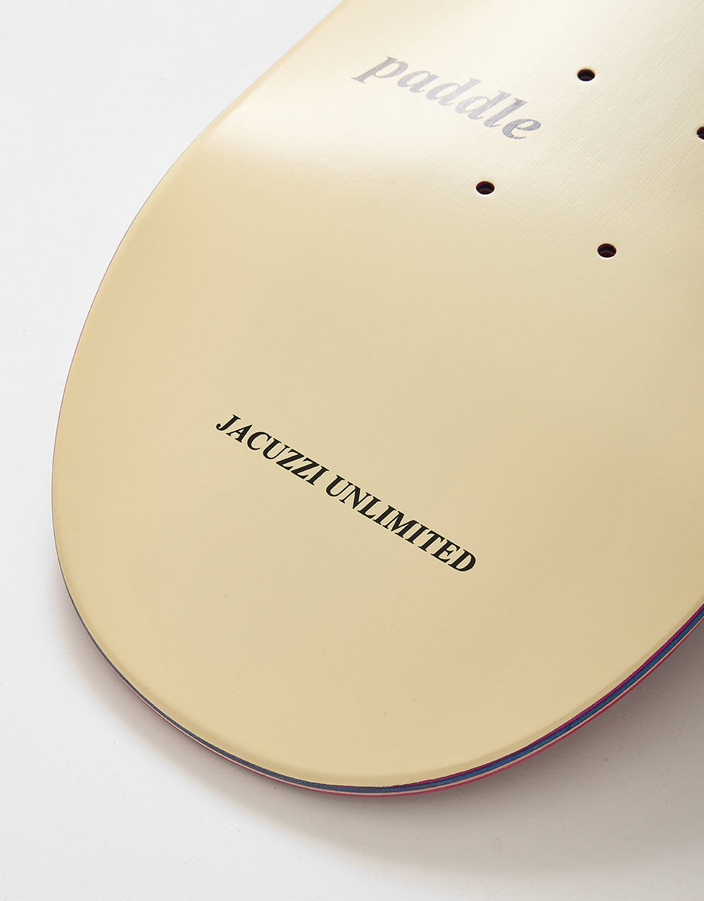 The Jacuzzi Unlimited Pilz Shits Creek EX7 Skateboard Deck is a pro model for Jackson Pilz coming in at 8.5" wide. The graphic features someone in a paddle boat under the top bolts, with the words 'Up shits creek without a paddle' underneath, off centre to the left on a sand background. Pilz name sits on the nose and Jacuzzi branding on the tail.